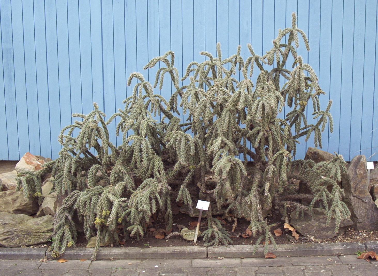 EDIT: Sorry, auf diesen "Übersichtsphotos" in meinem Blog sieht man die einzelnen Pflanzen ja gar nicht. Hier hab' ich jetzt mal zwei Photos - einmal ein Kaktus der sich für den Winter hingelegt hat, und einmal einer, der im Winter eher aufrecht bleibt.