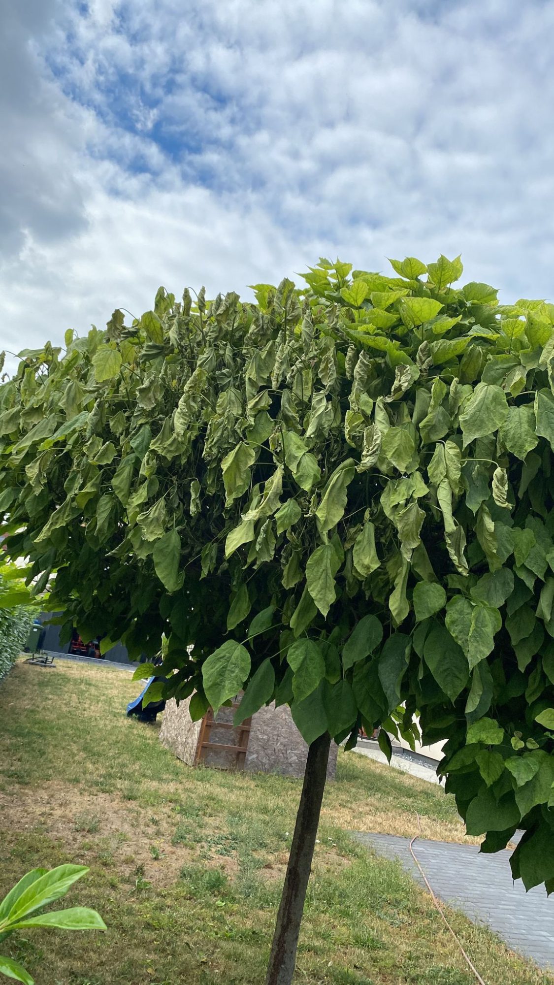 meine Tochter hat letztes Jahr von einem Kugel Trompetenbaum einen Ast abgebrochen. Der Ast wurde komplett abgenommen und die Wunde mit Öl (?) Versiegelt. Jetzt sind die Blätter auf einer Seite verdorrt. Die andere Seite sieht gut aus. Ist der Baum noch zu retten?