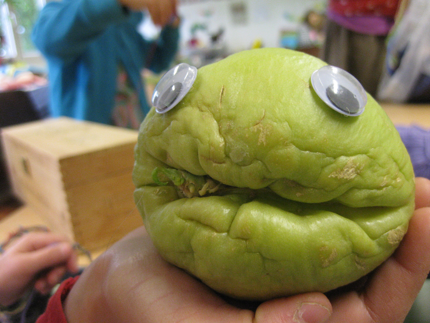 der niedliche Kürbis weckt in den Kindern das Bedürfnis,ihn in die Hand zu nehmen,seine Mimik nach zu ahmen und sogar mit ihm zu kuscheln...