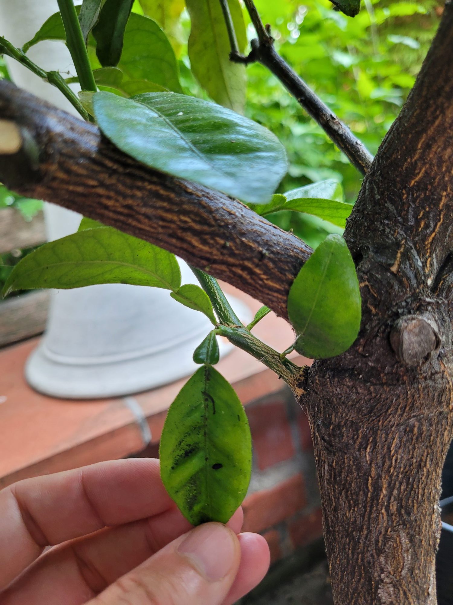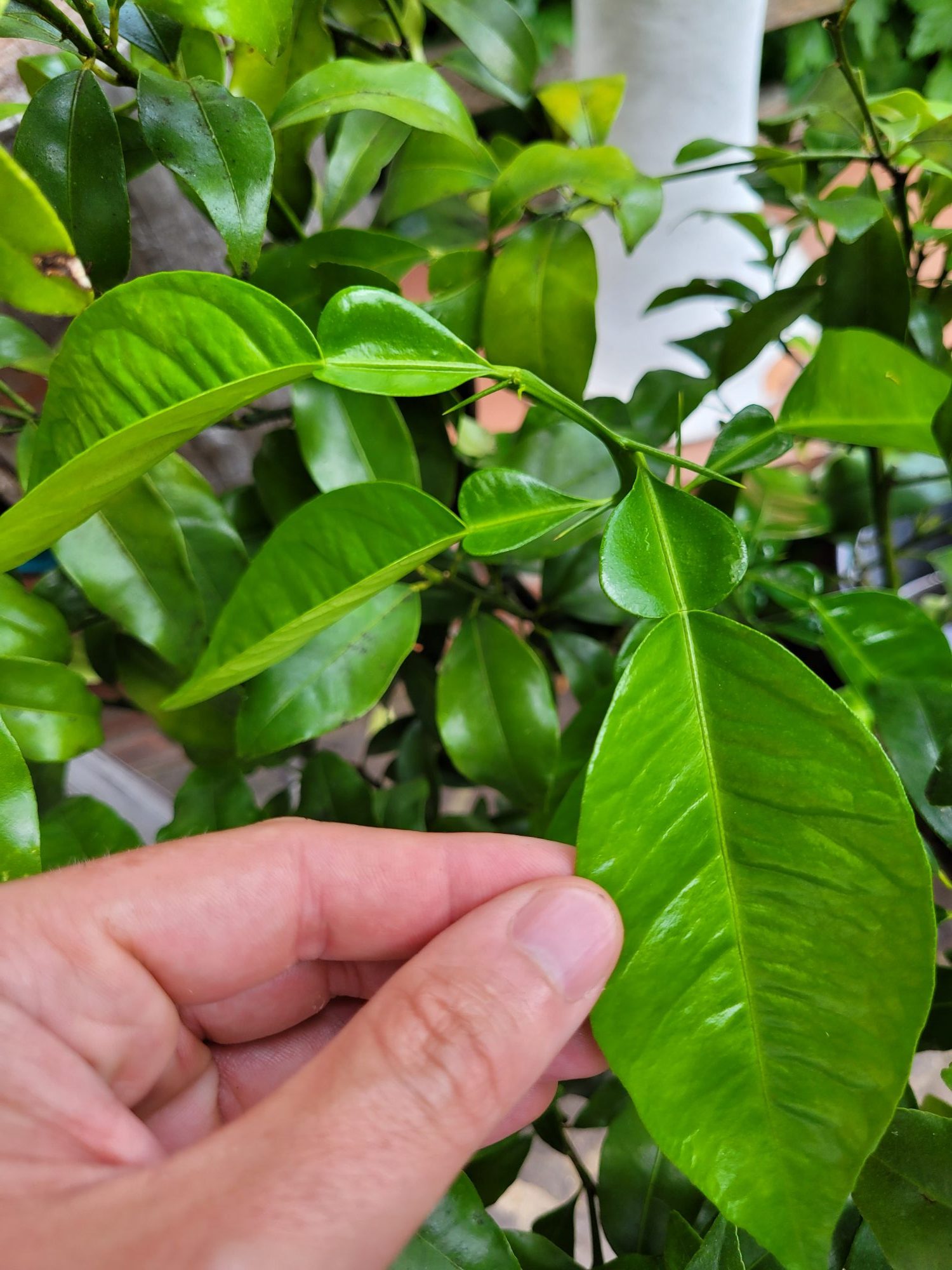 mir sind an meinem Kumquat Blätter aufgefallen die deutlich größer sind und andere Farbe haben. Bei genauem Hinsehen hab ich dann entdeckt dass die ganz merkwürdig 2-geteilt sind und zwar alle Blätter die aus einem Trieb kommen.