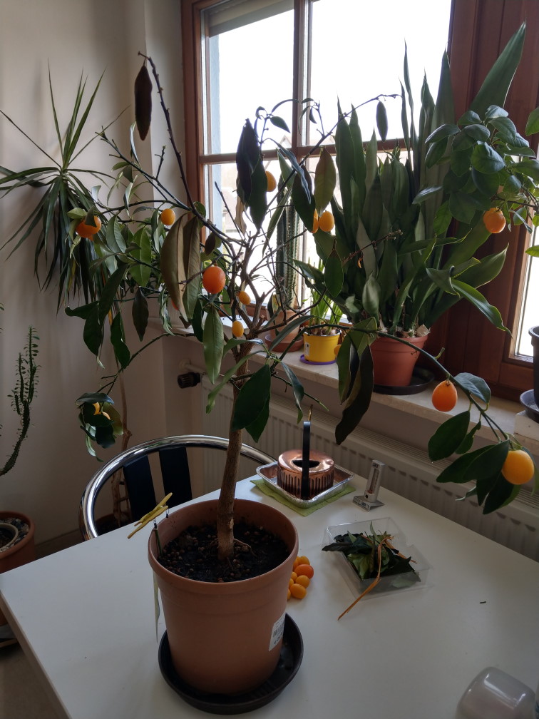 Die letzten Tage bekam ich das Gefühl, dass die Kumquat "aufgewacht" ist. Und gestern hatte ich wieder extrem hängende Blätter. Deshalb einmal baden lassen, da kamen mir mehr Blasen entgegen, als ich gehofft hatte. Jetzt steht die Pflanze Nahe ihres üblichen Standorts (Ostfenster), allerdings zur Umgewöhnung noch nicht in der vollen Sonne. Aber: Die Blätter fallen nur so runter, die Früchte ebenso. Ein oder zwei kleine Äste scheinen mir braun geworden zu sein, der Rest ist grün.