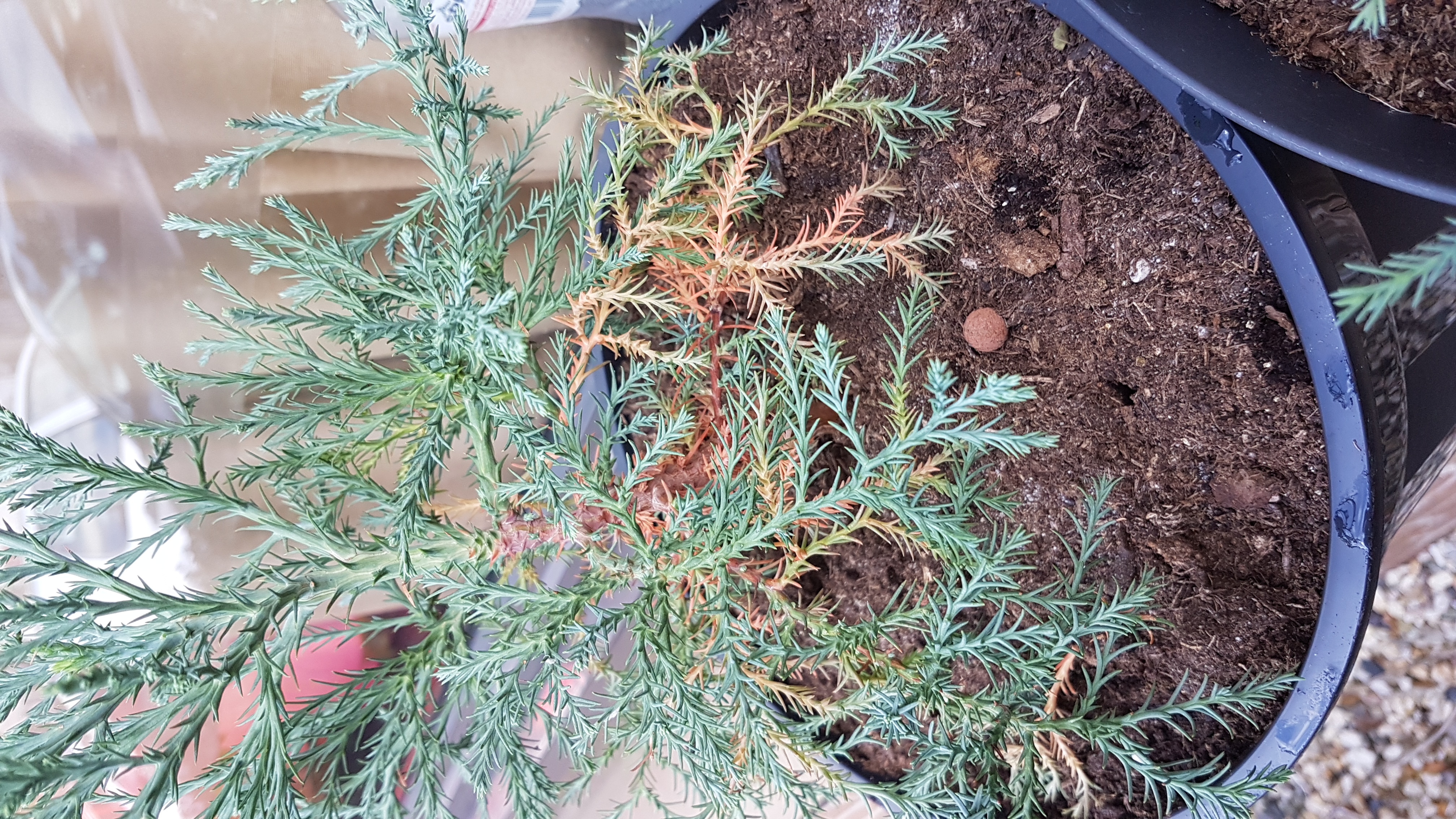 Im Sommer war ich eine Woche auf Sylt, zu der Zeit war es hier in den Niederlanden 40+°C. Zwei kleinere Mammutbäume in einem anderen Topf haben eine ähnliche Färbung angenommen und sind innerhalb weniger Tage eingegangen. Sie bekamen zu wenig Wasser, denke ich. Der Unterschied zu diesem Baum ist allerdings, daß die Verfärbung viel langsamer voranschreitet und die Äste nicht hängen.