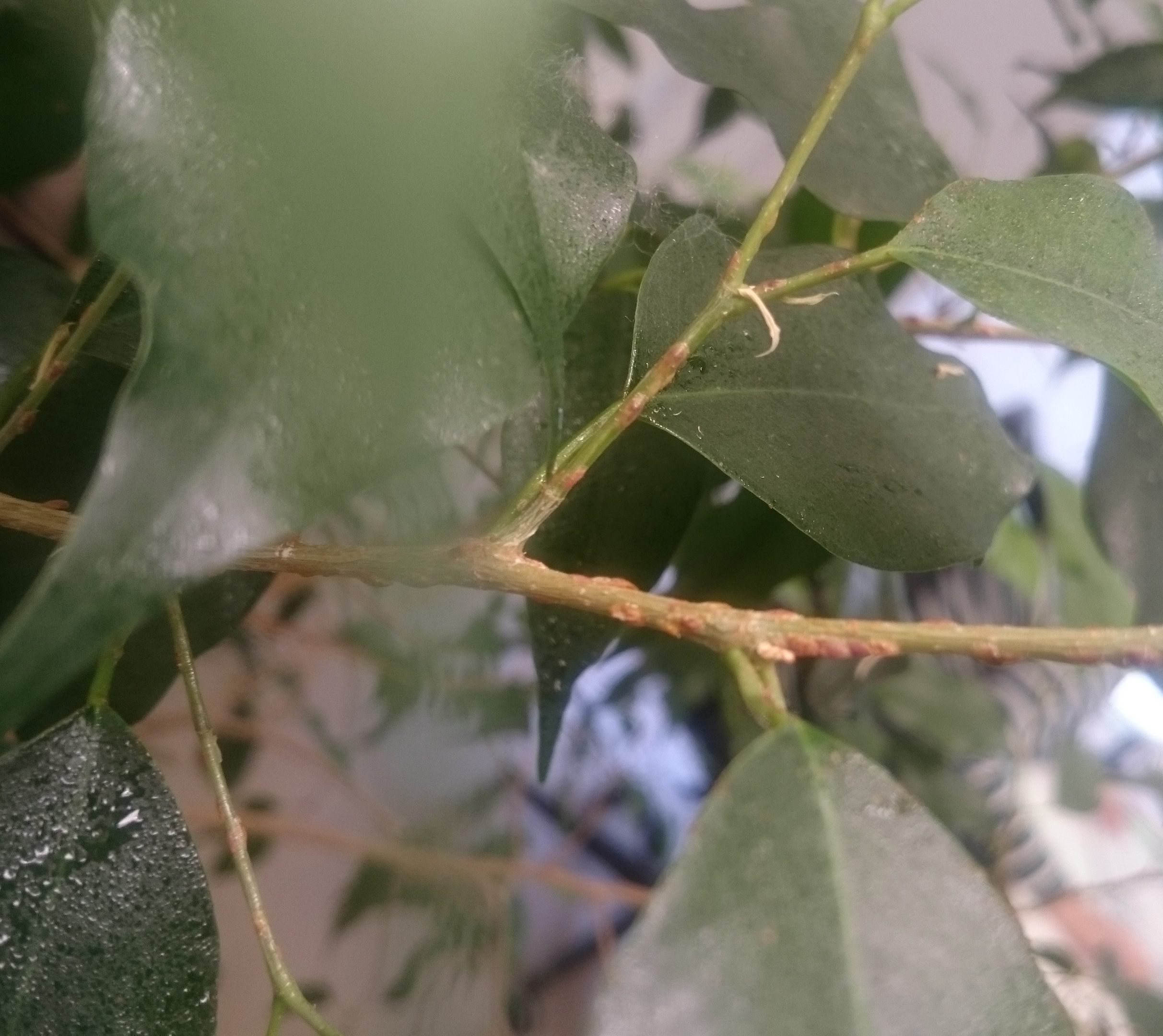 Da, diese braunen Knubbel auf den Ästchen. Und auf manchen Blättern sind diese klebrigen Tropfen, wie man links unten sieht?