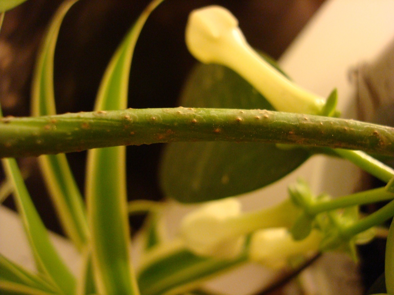 da ist nix. Das sind Ansätze von (Luft-) Wurzeln. Übrigens ist das kein Stock, sondern eine Pflanze. EIn Stock wäre http://de.wikipedia.org/wiki/Rhizom_%28Botanik%29. Und mir scheint, es seien Stephanotis floribunda gemeint und keine Hoya carnosa, oder was meinst du sonst mit dem Begriff "Kranzschlinge"?
