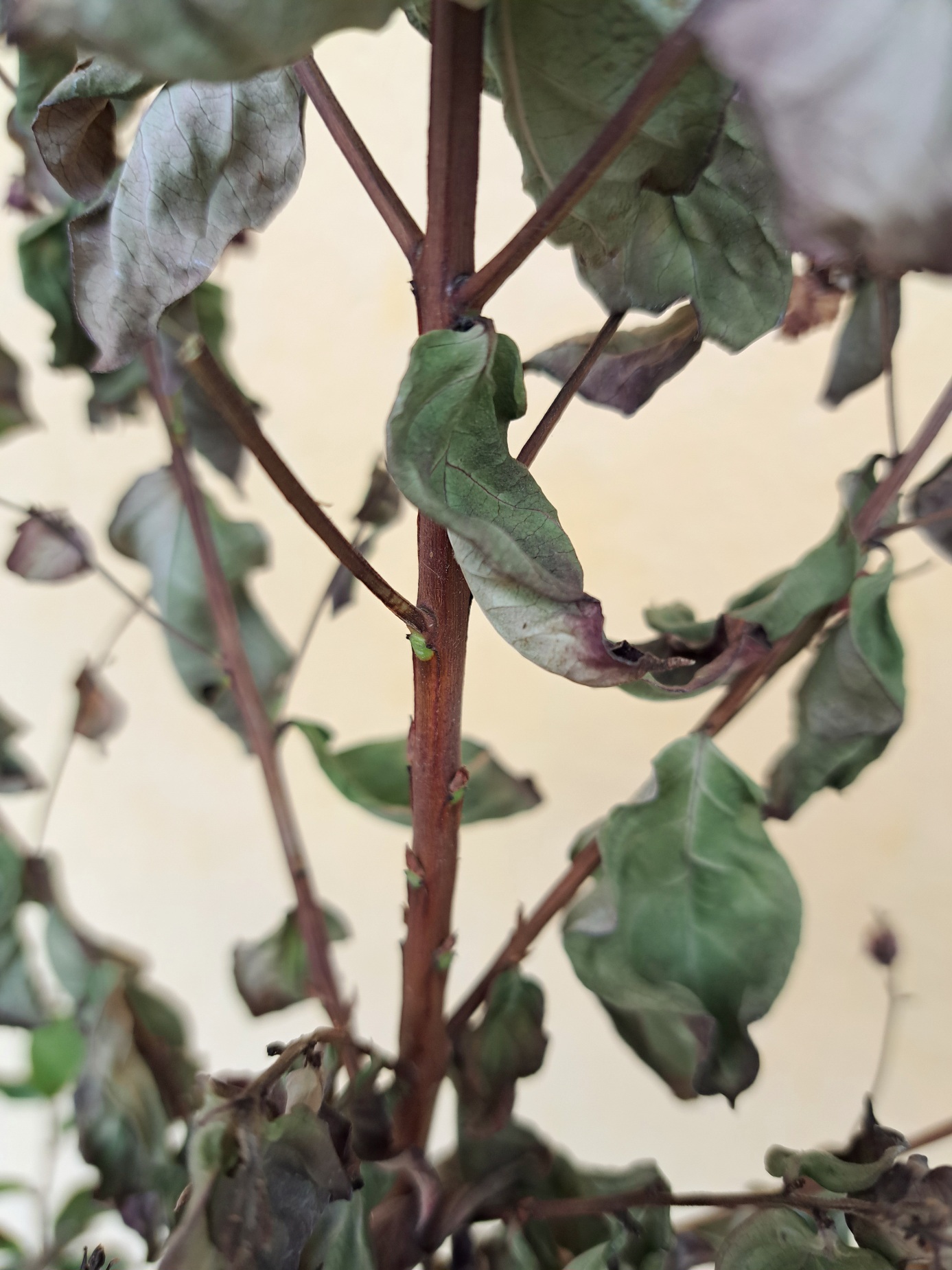 - Umpflanz-/Transportstress: Vom gleichmäßigen Produktionsklima auf einen sehr heißen Südbalkon = Verdunstungsschock. Die Wurzeln liefern nicht schnell genug → Knospen und junge Triebe trocknen zuerst ein.