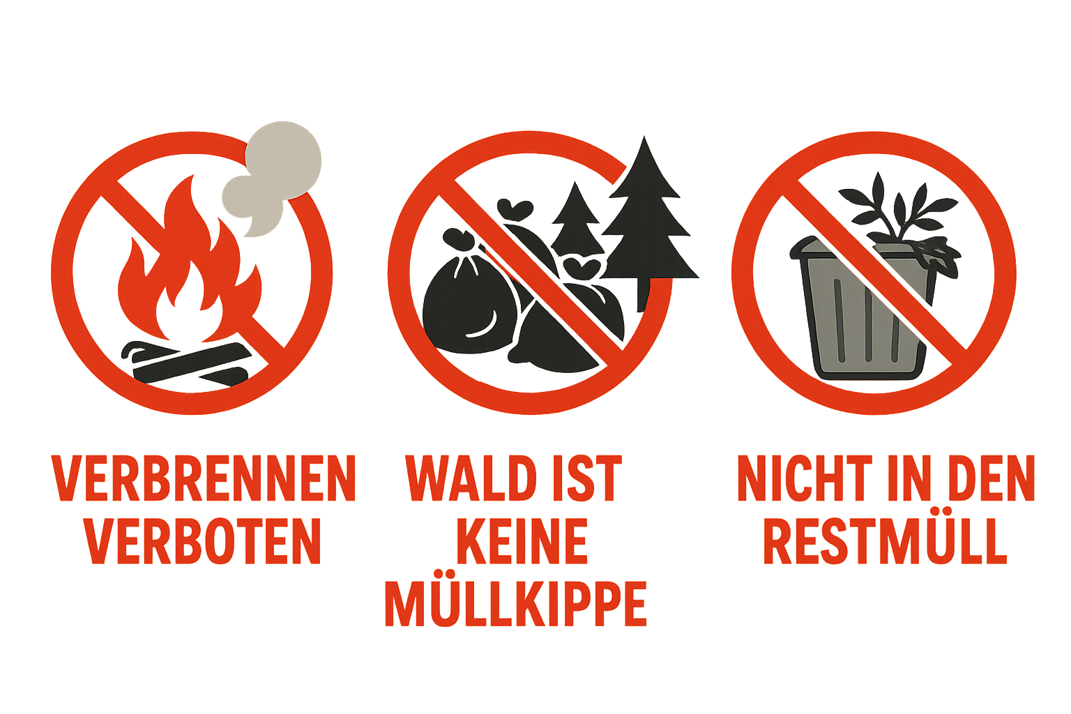 - Der Wald ist keine Müllkippe: Gartenabfälle im Wald oder auf Wiesen abzuladen, ist illegale Abfallentsorgung. "Sie überdüngen den Boden, bringen standortfremde Pflanzen (Neophyten) ein und stören das empfindliche ökologische Gleichgewicht".