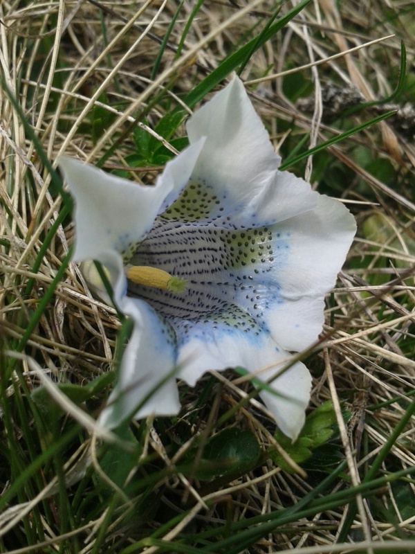 Bei meiner letzten Bergtour habe ich auch eine Besonderheit gefunden: ein (fast) reinweisser Enzian (Gentiana acaulis vermute ich). Die sind so selten, dass der Volksmund sagt, unter einem weissen Enzian liegt ein Schatz versteckt. Ich habe ihn aber lieber stehen lassen und nicht gebuddelt
