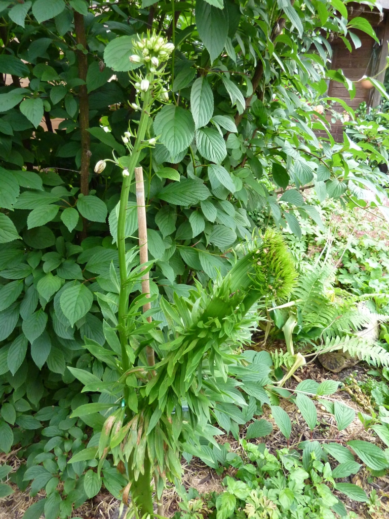 Die Türkenbundlilie bei unseren Nachbarn wächst schon verbändert aus dem Boden und weiß oben schon gar nicht mehr wohin. Ein Teil hat sich abgezweigt und bildet einen fast normalen Stiel. Wir hatten schon spekuliert, wie sie aussehen würde, wenn die ganzen Knospen blühen würden. Aber sie sind, bis auf eine am Rand, verkümmert und abgefallen. Letztes Jahr war dieselbe Pflanze ganz normal.