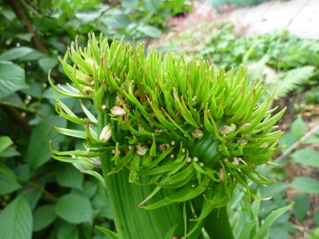 Die Türkenbundlilie bei unseren Nachbarn wächst schon verbändert aus dem Boden und weiß oben schon gar nicht mehr wohin. Ein Teil hat sich abgezweigt und bildet einen fast normalen Stiel. Wir hatten schon spekuliert, wie sie aussehen würde, wenn die ganzen Knospen blühen würden. Aber sie sind, bis auf eine am Rand, verkümmert und abgefallen. Letztes Jahr war dieselbe Pflanze ganz normal.