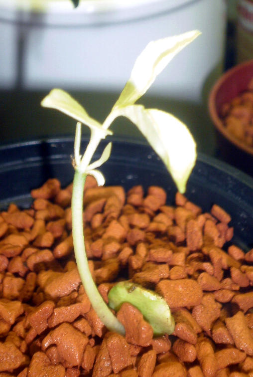Aus einem Kern wuchs ein 45cm langer Austrieb der dierekt über dem Kern einen Bogen wie ein D hatte und dann gerade nach oben wuchs.Leider bakam auch diese Pflanze nie ein Blatt und Verstarb.
