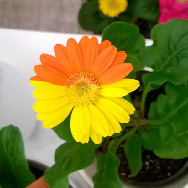 Beim Streifzug durch Holländische Gartencenter konnte ich am letzten Donnertag die abgebildete Gerbera finden. Bisher kannte ich zwar zweifarbige Sorten aber immer mit allen Blütenblättern gleich gefärbt. hier ist die Blüte hälftig zweifarbig, eine Zungenblüte soger in sich zweifarbig. Ist dies eine Laune der Natur oder Menschenwerk? Wie kann es zu einer solchen Chimärenbildung bei Pflanzen kommen?