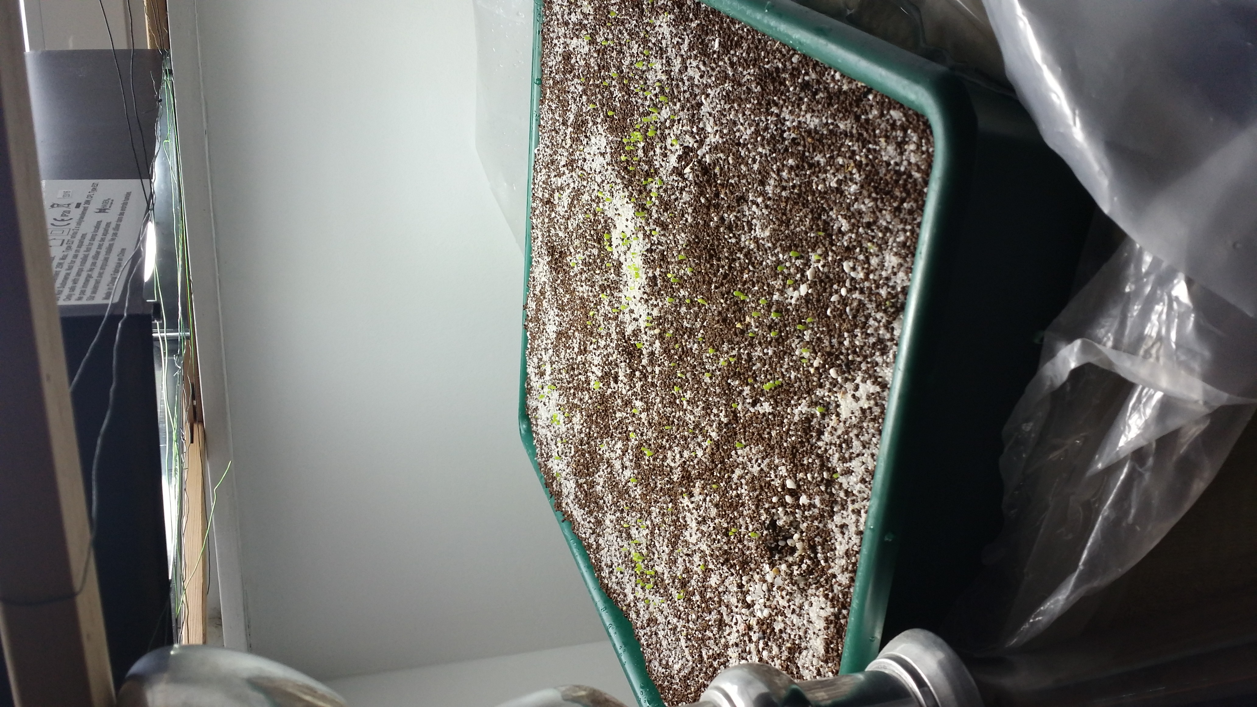 So sieht meine Aussaatschale per heute - ca. 18 Tage nach Aussaat- aus. Die Temperaturen sind seit ein paar Tagen merklich kühler (so 18 Grad tagsüber) und es ist auch bewölkter. Ich habe den Eindruck da keimt nun nix mehr, aber die Hoffnung stirbt zuletzt, denn es loegen noch ein paar Samen untätig rum. Die meisten Keimlinge kamen nach 3 bis 10 Tagen, danach keimte es deutlich weniger. Ich schätze es sind um die 250 Keimlinge in der Schale. Damit läge meine Keimquote bei 50%. Heute habe ich das Folienzelt abgenommen, damit mehr Licht an die Kleinen kommt. Dann habe ich eine Pflanzenlampe drüber gehängt in der Hoffnung das sie den Winter über ein bißchen weiter wachsen.
