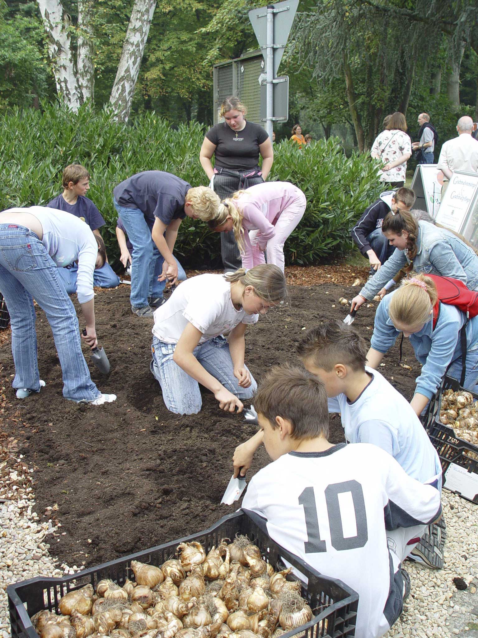 Sonntag, 17. September 2006: Jürgen Schick, Konrektor der Kolkrabenschule in Köln, mahnt auf dem Kölner Nordfriedhof seine Schüler: ?Du musst tiefer pflanzen, Sylvia, dreh die Zwiebel um, damit sie besser wachsen kann. Daniel, ein bisschen mehr System bitte, lass Melanie auch etwas Platz zum Pflanzen!? Mooooooment, Schule ? am Sonntag? ? auf dem Friedhof? ? Zwiebeln? Aber ja: Schon zum sechsten Mal in Folge fand in diesem Jahr am dritten Septemberwochenende bundesweit der Tag des Friedhofs statt. Ziel dieser Aktion ist, der Öffentlichkeit die Vielfalt der deutschen Friedhofskultur zu zeigen. Auf mehr als 100 Veranstaltungen im ganzen Bundesgebiet haben sich mehr als 100.000 Menschen in diesem Jahr informiert. Seit über drei Jahren besteht eine Kooperation zwischen der Kolkrabenschule und dem Verband der Kölner Friedhofsgärtner. Zum einen geht es ganz praktisch um Berufsinformation und Praktika bei Friedhofsgärtnern. Zum anderen werden die Kinder und Jugendlichen durch Führungen und Aktionen ? nicht nur am Tag des Friedhofs ? dazu angeregt, sich mit Tod, Trauer und Grabkultur auseinander zu setzen. In diesem Jahr stand am Tag des Friedhofs für die Schüler der Klassen 5 bis 10 der Kolkrabenschule neben Malwettbewerben, Lesungen und Trauerkranzbinden auch eine Pflanzaktion mit Narzissenzwiebeln auf dem öffentlichen Friedhofsgelände auf dem Programm. 10.000 Narzissen werden im nächsten Frühjahr den Friedhof in ein Blütenmeer verwandeln.