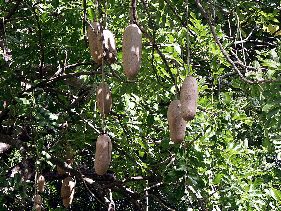 Recht stabil sind die gut 40 Zentimeter langen Früchte. Sie sind wurstförmig und faserig verholzt. Die ungeflügelten braunen Samen stecken in einer feuchten, eiweißhaltigen Einbettung in der Wurstfrucht des Baumes. Elefanten, Giraffen, auch Paviane schätzen diese Früchte. Vom Menschen werden die Früchte kaum genutzt. Früchte, Rinde und Wurzeln werden von Einheimischen zur Herstellung von Heilmitteln verwendet. Man setzt diese bei Bandwürmern, Geschwüren, Rheuma und Ruhr, aber auch gegen Syphilis ein. Der Stamm des Baumes eignet sich zum Bau von Booten.
