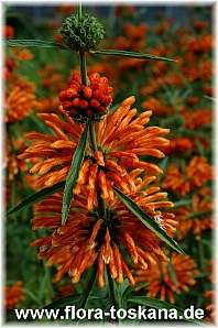 Hinweise: Eine mäßig anspruchsvolle Kübel- und Wintergartenpflanze, die leider äußerst bruchgefährdet ist. Sollte ein Trieb abbrechen, treibt Leonotis rasch wieder durch. Wählen Sie trotzdem am besten einen windgeschützten Standort fern von Durchgängen. Leonotis wirkt am besten in einer Gruppe von Kübelpflanzen, in der der sparrige Wuchs verdeckt wird, die auffälligen Blüten jedoch weithin sichtbar bleiben.