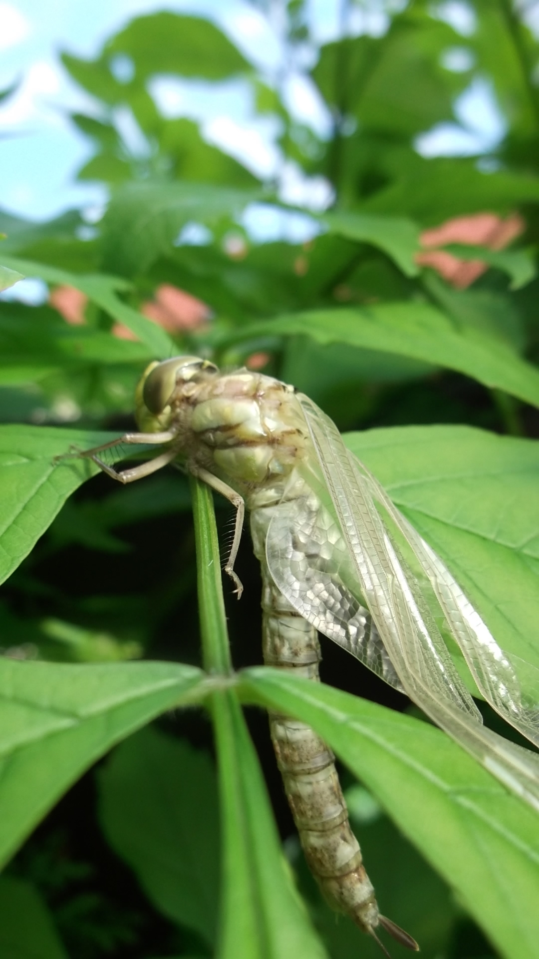 hier mal ein foto einer gerade schlüpfenden/sich entfaltenden libelle. sie trocknet noch ihre flügel, das ist der für sie gefährlichste zeitpunkt, denn da ist sie eine leichte beute. welche genau es ist, weiß ich aber auch nicht......