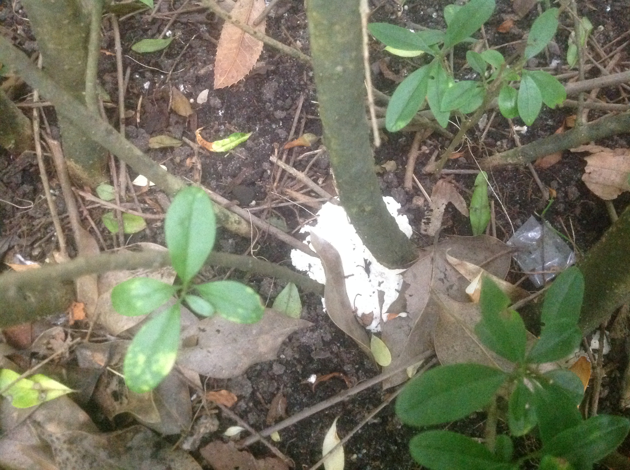 Um den Stamm der Pflanzen herum, direkt auf dem Erdboden, selten mit etwas Erde bedeckt, ist ganz eng rund herum ein weißer Bewuchs. Mit etwas Mühe kann man ihn abheben, er riecht nach Pilz.