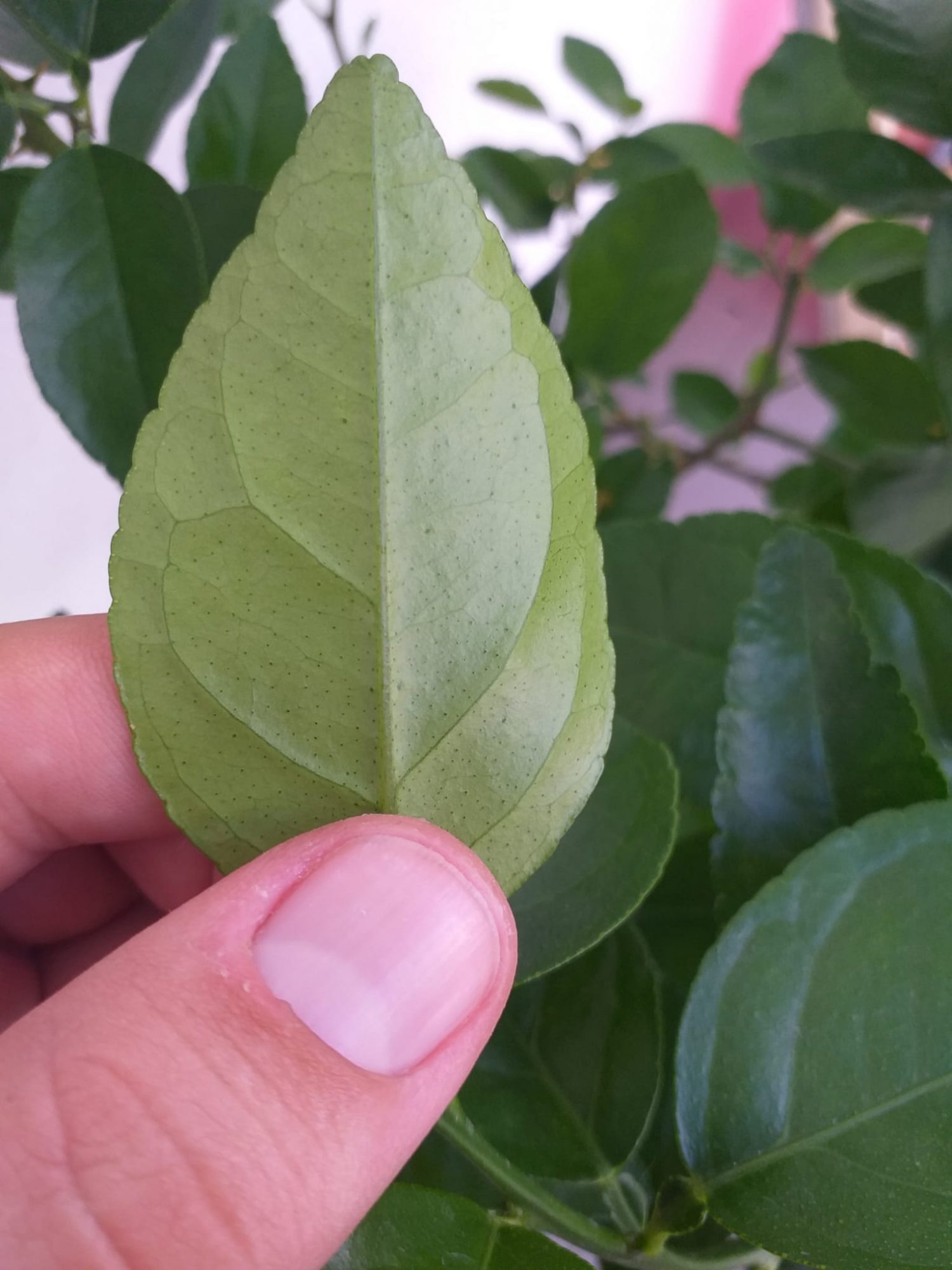 Der aktuelle Zustand der Limette ist gut, die Öldrüsen normal. Ich hätte beim Schneiden etwas stärker auf die Form geschaut (senkrechter Langtrieb rechts, schwächlicher «Besen» links), aber das tut der Pflanze nicht weh. Beim letzten Foto wäre die aufgehellte Stelle (noch Spinnmilben unter dem Blatt?) sowie die beiden dunklen Krümel (Citrus-Milben Panonychus citri?) zu prüfen. Letztere sind etwas anders gestrickt als die Spinnmilben, spinnen nicht, sind eher einzelgängerisch unterwegs und bleiben deswegen gerne lange unentdeckt, bis die Zahl der Saugstellen anfängt aufzufallen und der Pflanze langsam doch nicht gut tut.