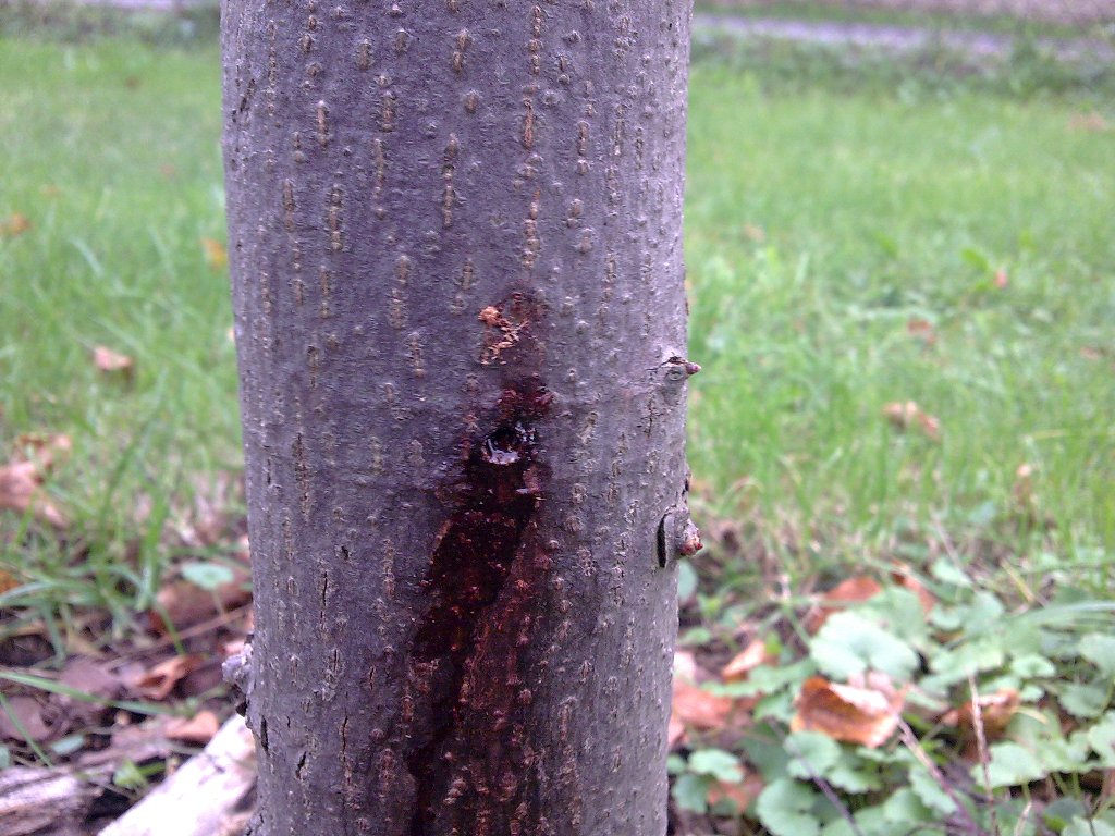 Bei genauerer Untersuchung des Stammbereiches fielen mir 2 ca. 4 mm große Löcher auf, aus denen auch Flüssigkeit heraus lief. Mittels einem dünnen Draht konnte ich feststellen, dass die Löcher unter der Rinde weitläufiger sind und anscheinend zu "Gängen" werden. Ich hatte zunächst eine Wurzelerkrankung vermutet, aber auf Grund der Löcher denke ich hier an einen Schädlingsbefall. Ich habe hierzu nochmal ein Foto gemacht.