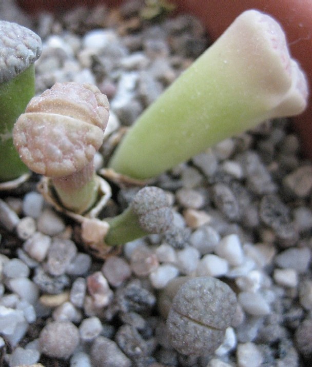 Hier ein Bild meiner Sorgenkinder, die beiden oberen sind farblos, oben ziemlich hart und runzelig, ansonsten "gummimäßig zerdrückbar". Den Lithops drumherum geht es gut.