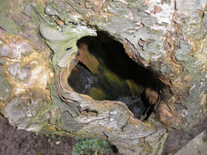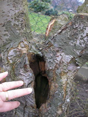 Meine Freundin hat in ihrem Garten einen 18 Jahre alten Pflaumen-Spindelbaum.Der hat im Stamm ein ca.30cm großes tiefes Loch.