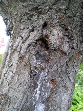 Doch leider stellten wir nach kurzer Zeit fest, dass sich an einer anderen Stelle am Stamm, noch unterhalb der Stelle an der sich die Hauptäste verzweigen, ein Loch befindet. Dieses Loch hat sich sehr schnell erweitert - ist größer geworden und mittlerweile befinden sich schon mehrere Löcher in der Nähe (siehe Foto). Außerdem zieht sich unterhalb der Löcher eine weißliche "Spur" - blutet der Baum da?