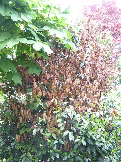 ich würd gern wissen was mein lorbeer hat. die genaue sorte kenn ich nicht. seit dem frühjahr (märz /april) bekommt er immer mehr braune blätter, sodass nun mitte mai der halbe strauch braun ist. es gibt insgesammt 12 solcher großen sträucher in reihe und nur dieser eine hat braune blätter. ist er zu stark zurück geschnitten worden? die anderen sträucher sind aber auch zurückgeschnitten worden. hat er als einziger eine krankheit oder verträgt er den kastanienbaum in naher nachbarschaft nicht? der kastanienbaum steht dort allerdings auch schon fünf jahre. und bisher ging es beiden bäumen/sträuchern sehr gut. ich würd gern wissen warum der lorbeer so braun wird und was ich dagegen tun kann.