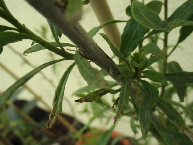 ich konnte uebrigens keine parasiten auf den blaettern erkennen. das einzige was ich gefunden habe, sind ein paar ganz kleine schwarze spinnen (gut zu erkennen mit dem Auge) die einen kleinen weissen punkt auf dem ruecken haben. die ziehen dann ihre faeden von einer pflanze zu anderen, ich denke, das sind aber ganz normale spinnen, die es eben draussen so gibt und sie schaedigen die pflanze nicht oder? ich hatte die pflanzen vor einigen tagen mit einer mischung aus wasser, bio- apfelessig, etwas spuelmittel, algenextrakt und neo chinosol besprueht. schwer zu sagen, ob es was bringt, da ich ja im grunde nicht weiss, was es denn ueberhaupt ist. beim bespruehen haben sich die spinnen von den faeden fallen lassen, aber jetzt sind sie auch wieder da. Es sind aber jetzt nicht uebermaessig viele, glaube auch nicht, dass sie was damit zu tun haben