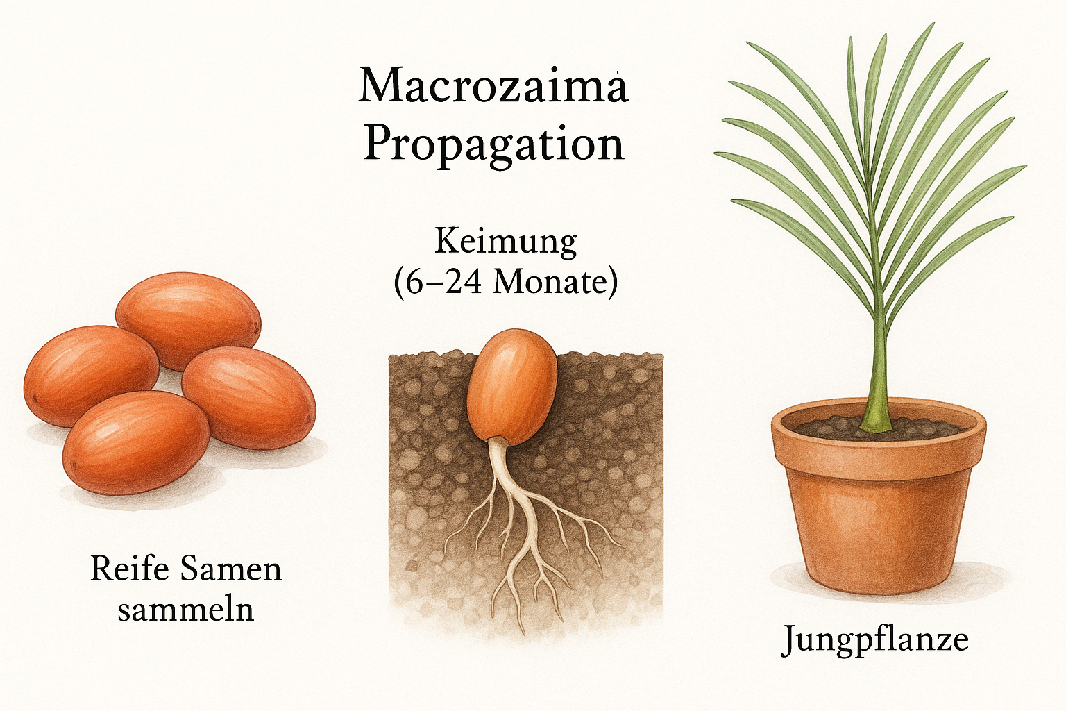 Die Vermehrung von Macrozamia erfolgt fast ausschließlich über Samen und ist ein Projekt für geduldige Gärtner. Die Keimung kann zwischen 6 und 24 Monaten dauern!