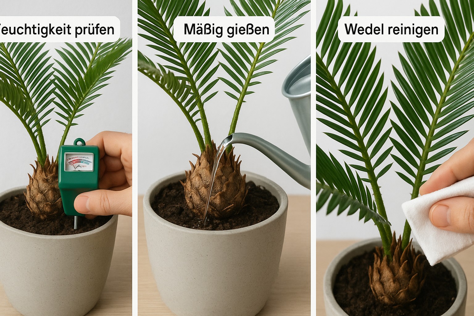 - Wurzelfäule: Durch zu viel Wasser. Symptome sind gelbe, welke Wedel und ein weicher Caudex. Meist nicht mehr zu retten.