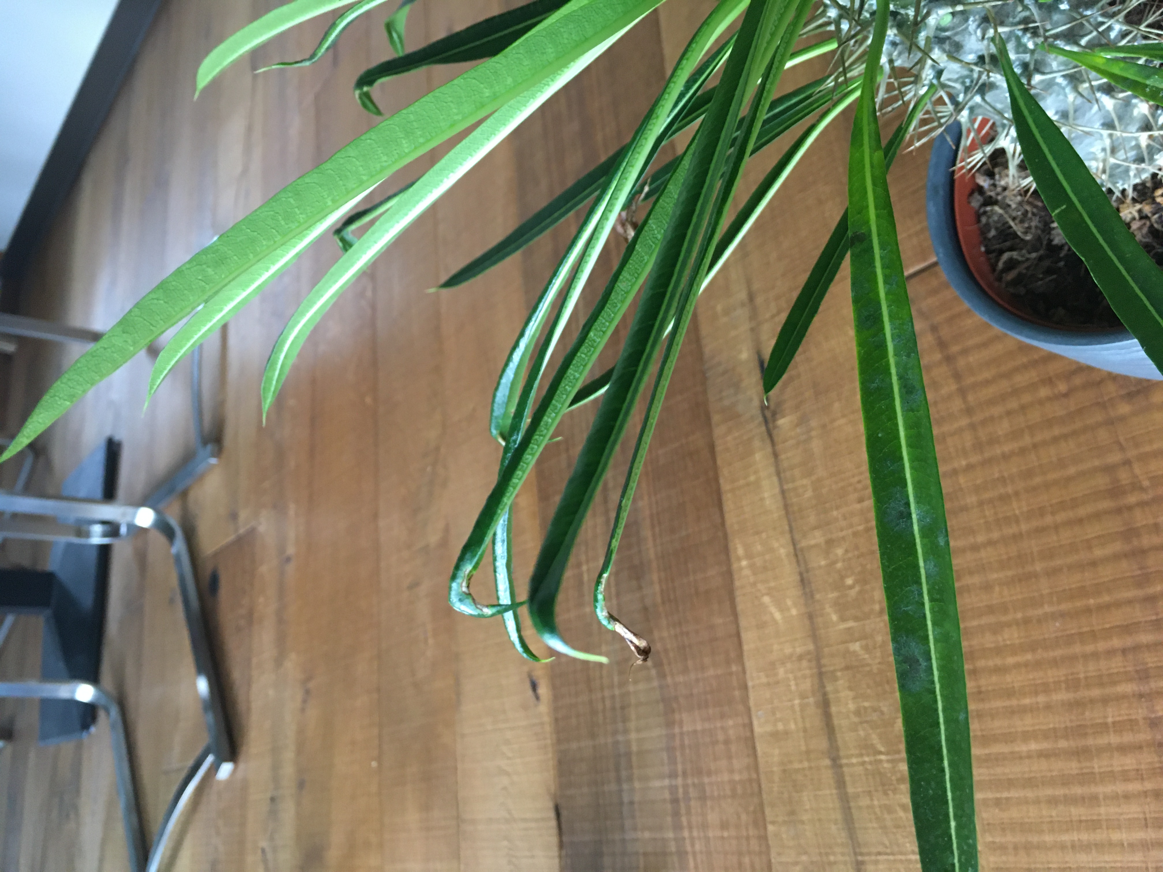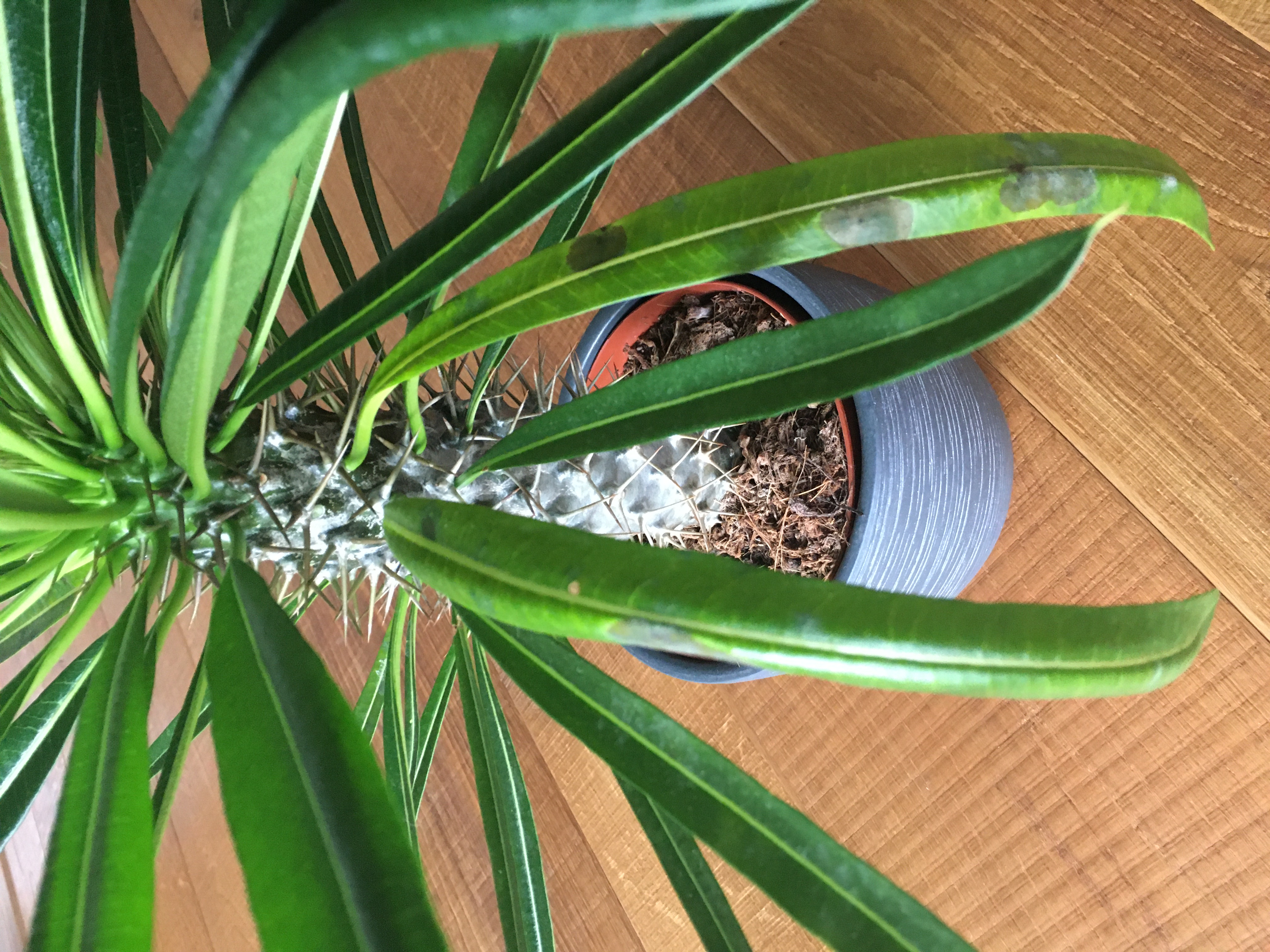 Meine Madagaskarpalme lässt zur Zeit viele Blätter fallen, die braun-graue Flecken aufweisen. Des Weiteren sind viele "gesunde" Blätter am Ende eingerollt. Vor 2 Tagen habe ich auf einem Blatt eine braune klebrige Flüssigkeit (ähnlich wie Harz) auf einem Blatt vorgefunden.