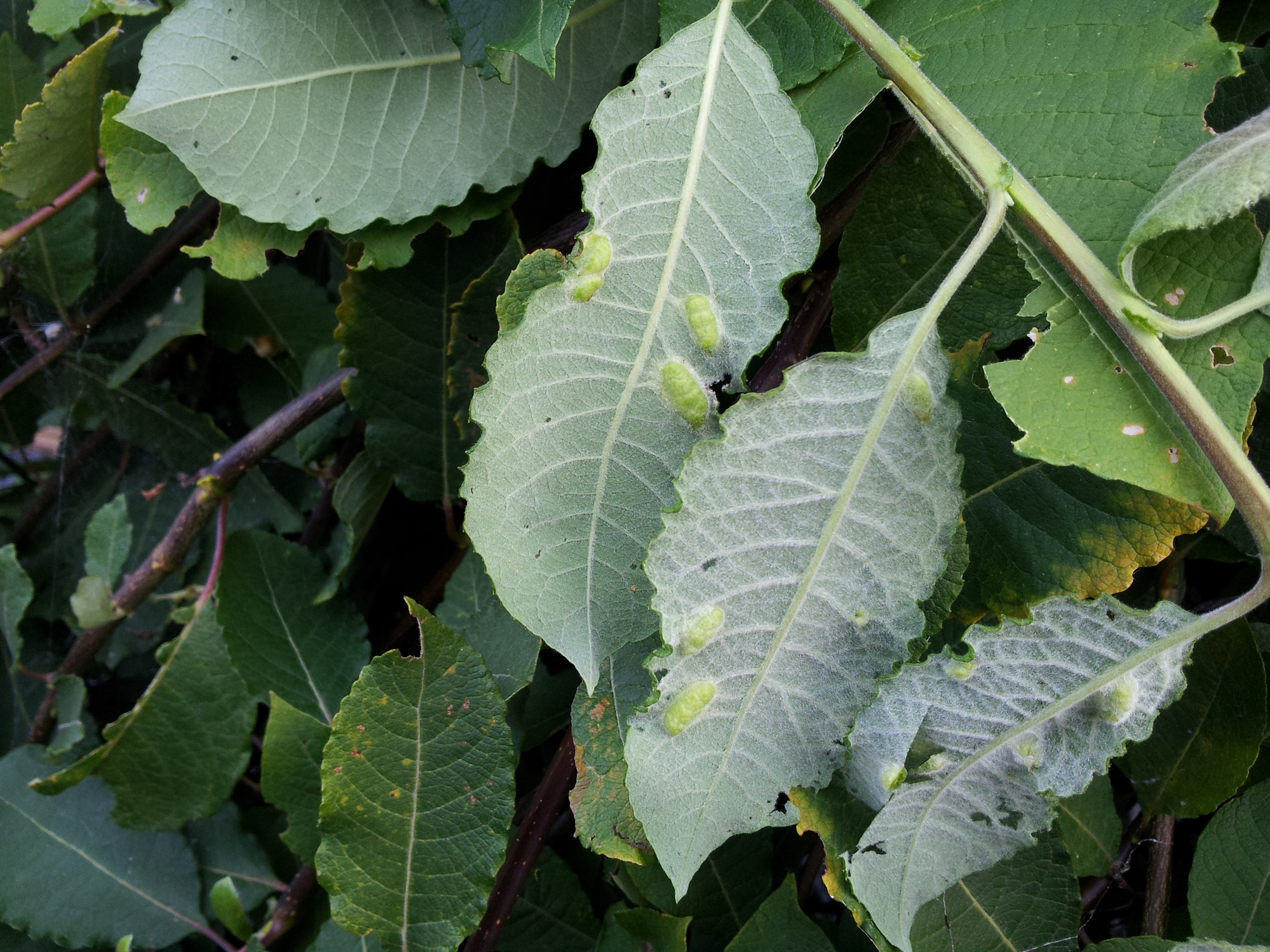 Die Verursacher sind Weidengallenblattwespen, vermutlich aus der Gattung Pontania.