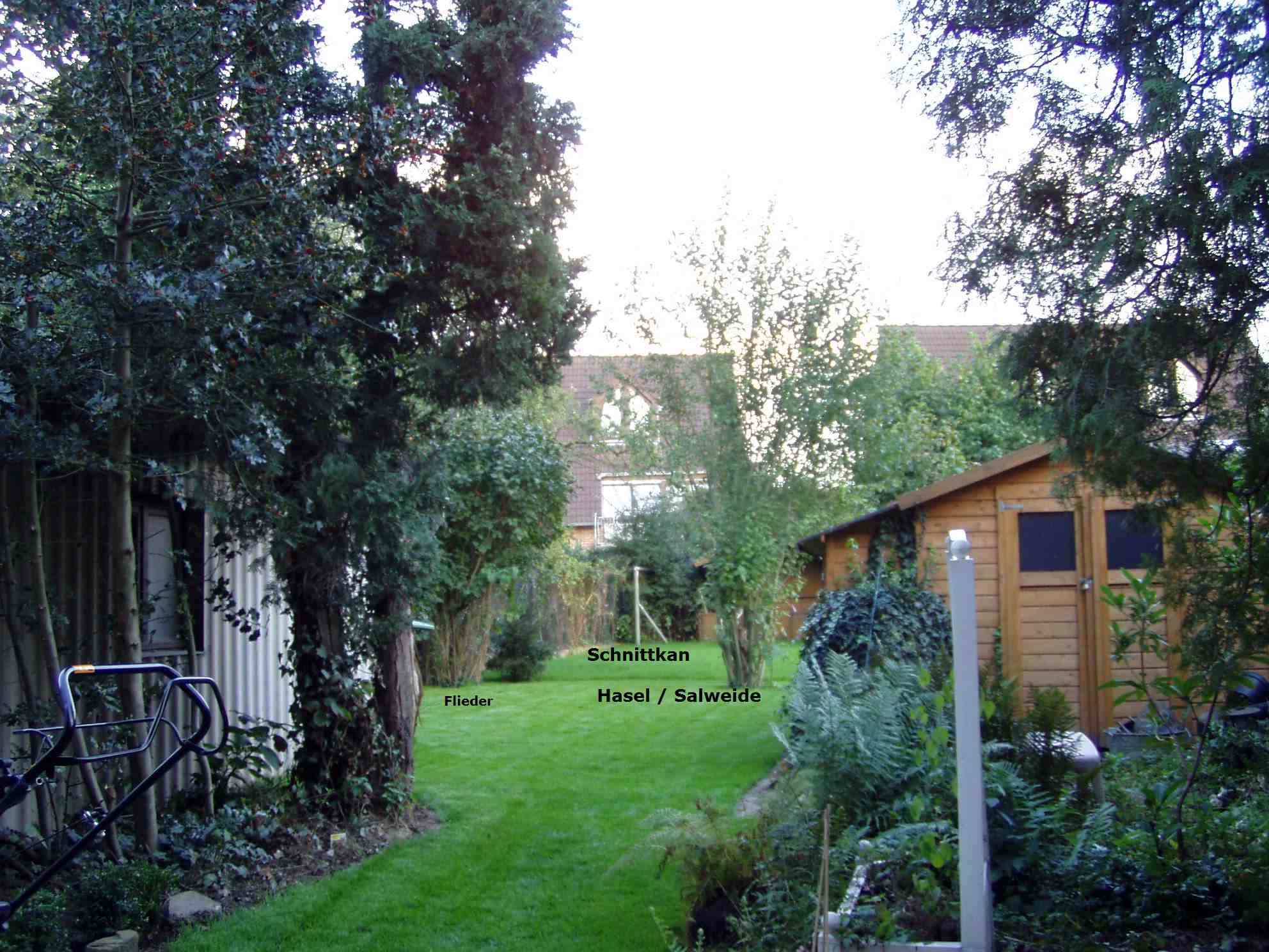 Jetzt hat mein Mann gestern das Stück gemäht, das ziemlich fest ist, dahinter das Stück hat er stehengelassen, der Unterschied ist deutlich auf dem Bild zu sehen - zwischen Flieder und Hasel / Salweide steht eine richtige Kante.