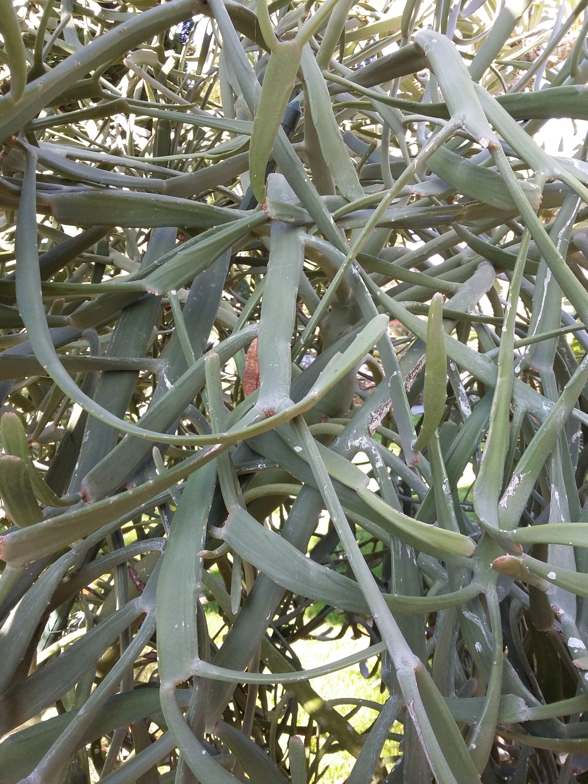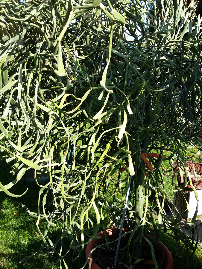 Auf der Mainau habe ich im September d.J. eine hier abgebildete Euphorbiaceae gesehen. Sie stand im Freien und war leider unbeschildert. Dass es wohl ein Wolfsmilchgewächs ist, war an einem weißen Milchsaft zu erkennen, der beim sanften Biegen eines Pflanzenteils hervorquoll. Kennt jemand diese Art?