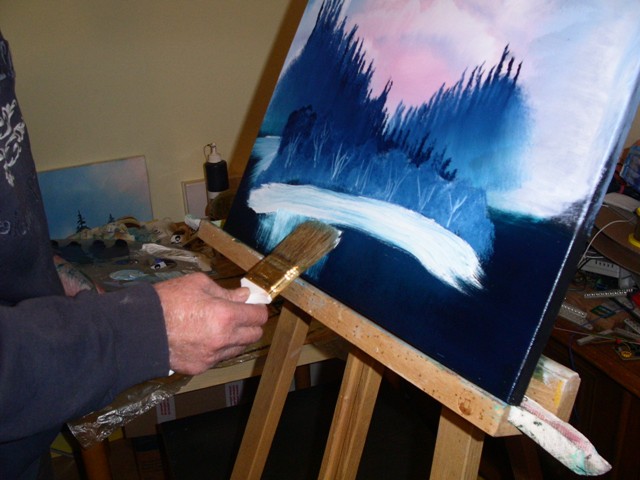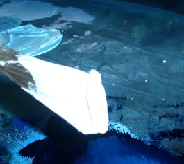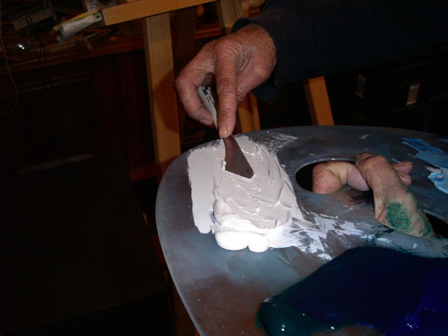 Dazu nehmen wir mit dem Messer Farbe auf. In diesem Fall Titanweiss und Phthaloblau.