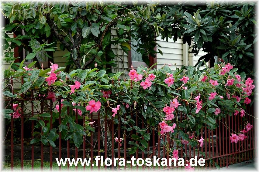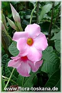 Die Mandevilla-Sorte `Alice du Pont´ ist in allem die Größte ihrer Familie: Die rosafarbenen Blütentrichter sind mit gut 10 cm die größten, ihre oval-länglichen, tief strukturierten, dunkelgrünen Blätter sind die größten und ihr Wuchs ist am kräftigsten. Die Triebe der starkwüchsigen Schlinger können mehrere Meter pro Saison zulegen, die man entweder mehrfach um die Kletterhilfen legt oder an Drähten entlang leitet, um zum Beispiel Wände im Wintergarten zu begrünen. `Alice du Pont´ ist bei reichen Wasser- und Düngergaben ausgesprochen blühfreudig und wird es nicht müde, immer neue Blütentrichter in reicher Zahl zu öffnen, sobald und solange die Temperaturen konstant über 15 °C liegen. Der Lichtanspruch ist gering und die Blüten-Ausbeute auch in teilschattigen Lagen sehr hoch.