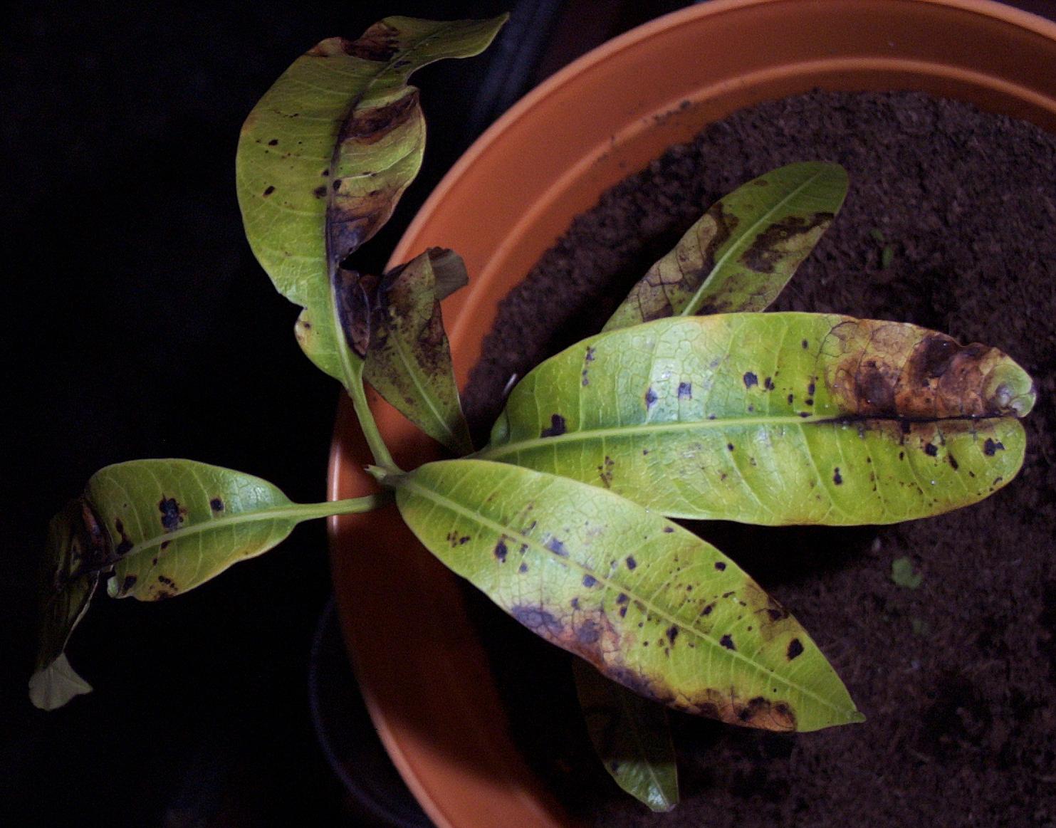 Meine Mango bekommt seit einiger Zeit braune Blätter. Das geht von den Rändern los und arbeitet sich das Blatt in Richtung Pflanze vor. Das Blatt fängt dann irgendwann an, sich leicht zu kräuseln und sieht dann aus wie ein Herbstblatt. Irgendwann fällt es komplett braun ab. Betroffen sind alle (drei) Blätter.