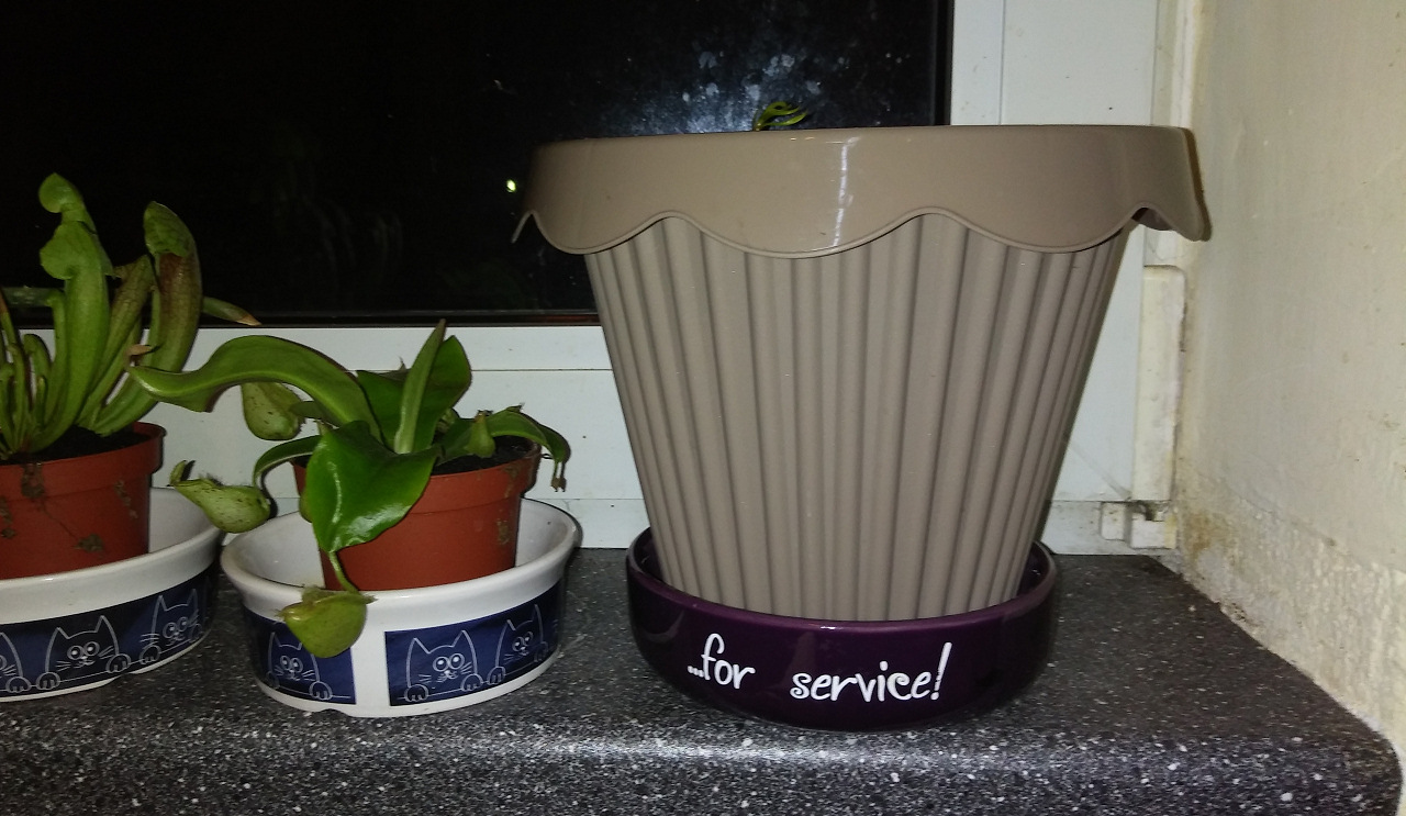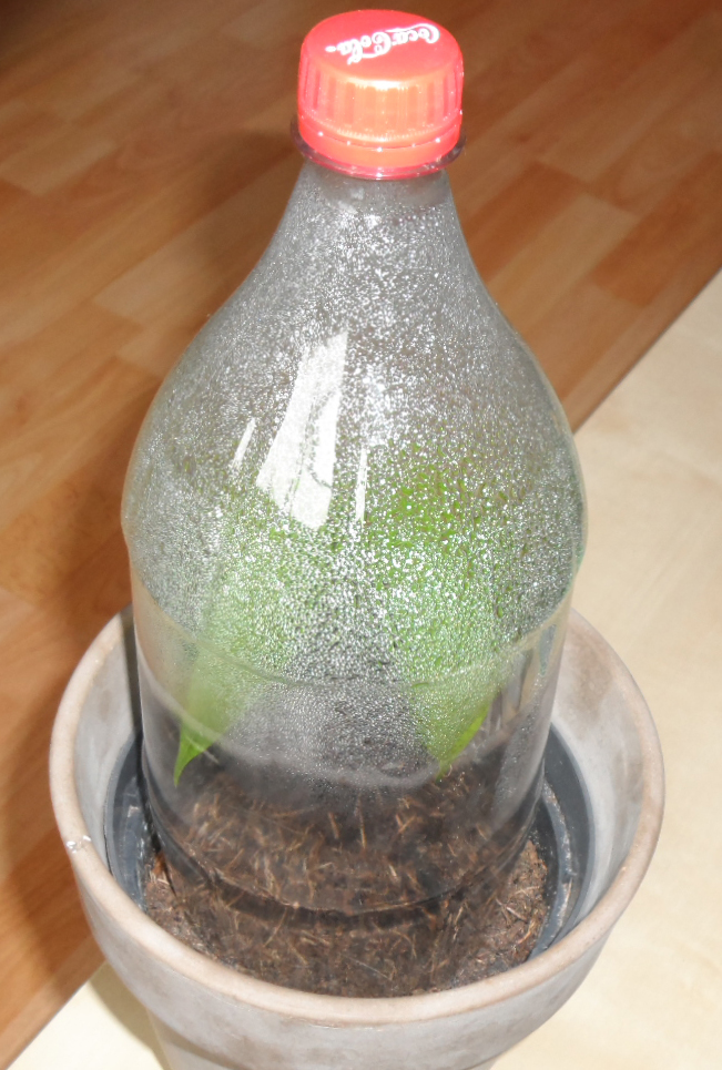 Ich habe gelesen, dass die Pflanze eine Hohe Luftfeuchtigkeit mag. Jetzt war ich so frei und hab einfach den Boden einer 2l Colaflasche entfernt und diese dann über die Pflanze gestülpt. (Vom entfernen kommen auch die paar Erdkrümel auf den Blättern)