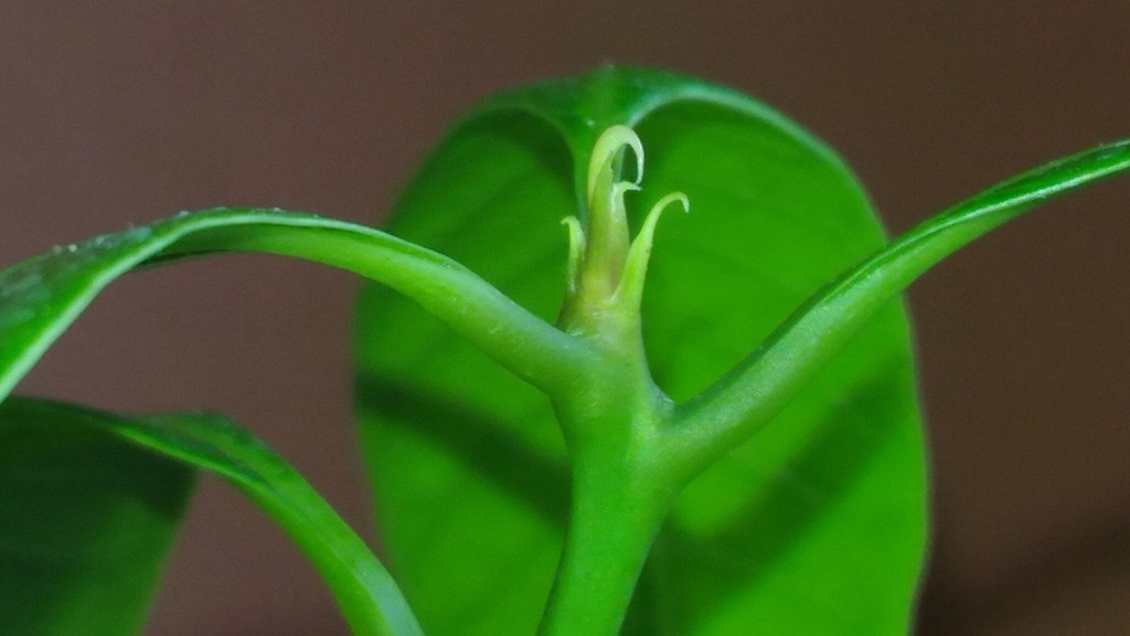 Die Pflanze hat, seit sie gekeimt hat eigentlich, diesen seltsamen Auswuchs (?), von dem ich nicht genau weiß, was ich davon halten soll. Auf der gegenüberliegenden Seite auf gleicher Höhe war für die ersten paar Tage ein kleiner Stiel mit dunkelbraunem Ende, der gesamte Stiel ist aber dann abgefallen.