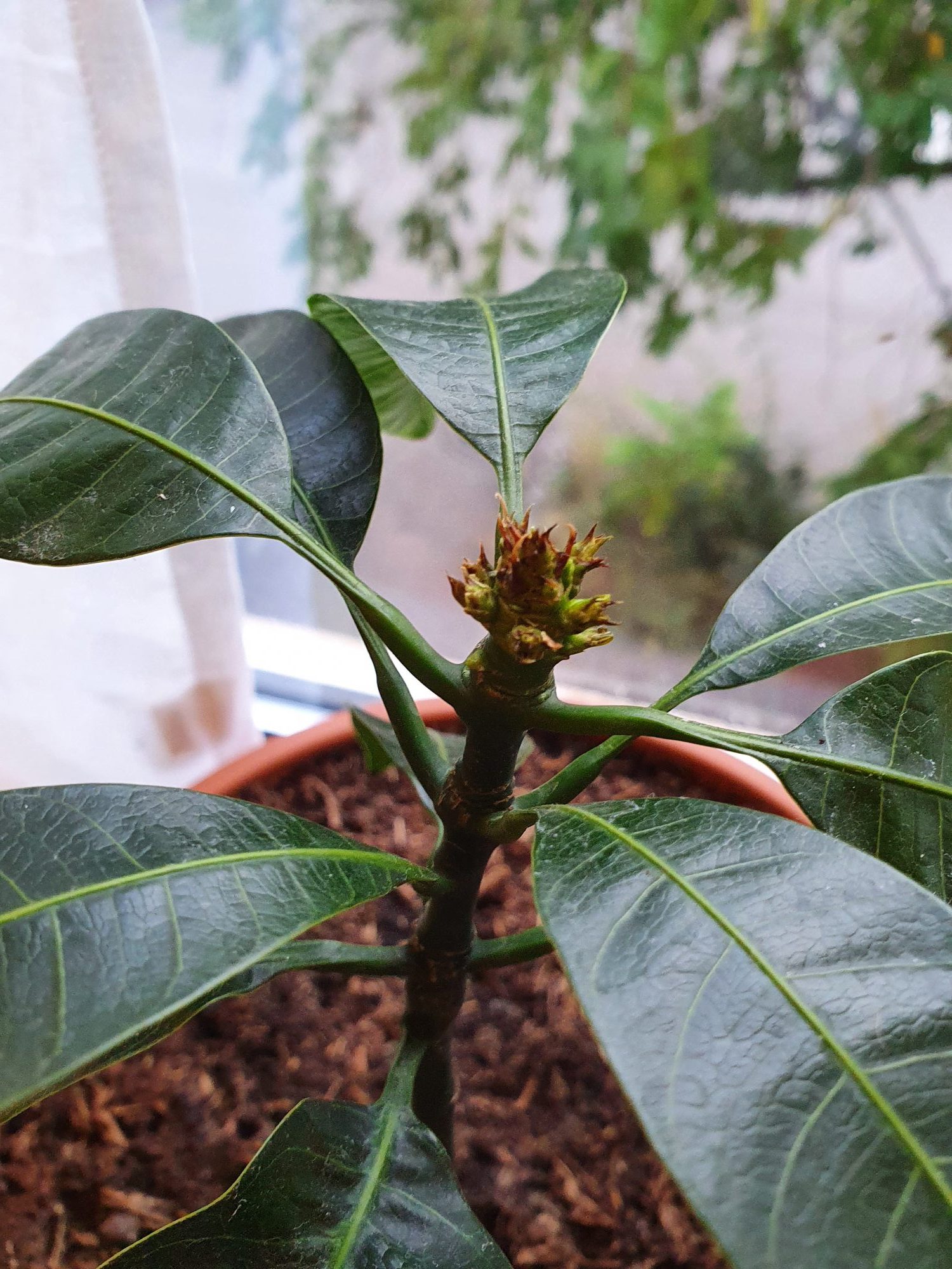 Nach dem Umtopfen empfand ich das es der Mango gut ging und sie das Umtopfen gut überstanden hat. Ich konnte bei der Mango auch beobachten das sie den Versuch zu wachsen immer wieder unternommen hat, doch kaum waren die kleinen Blätter zu sehen, waren sie direkt mit einem bläulich/gräulichen Flaum belegt. Ich dachte sofort an Schimmel. Die kleinen Blätter sind dann verkümmert und abgefallen. Diesen Versuch hat sie immer und immer wieder gestartet mit dem selben Ende. Nun ist Winter hier in Deutschland und trotzdem versucht sie es weiter. Das sie es immer und immer wieder versucht sieht man auch sehr gut auf dem zweiten Bild. Was mache ich falsch? Weiß jemand Rat? Ich mag die kleine Mango und möchte sie nicht aufgeben.