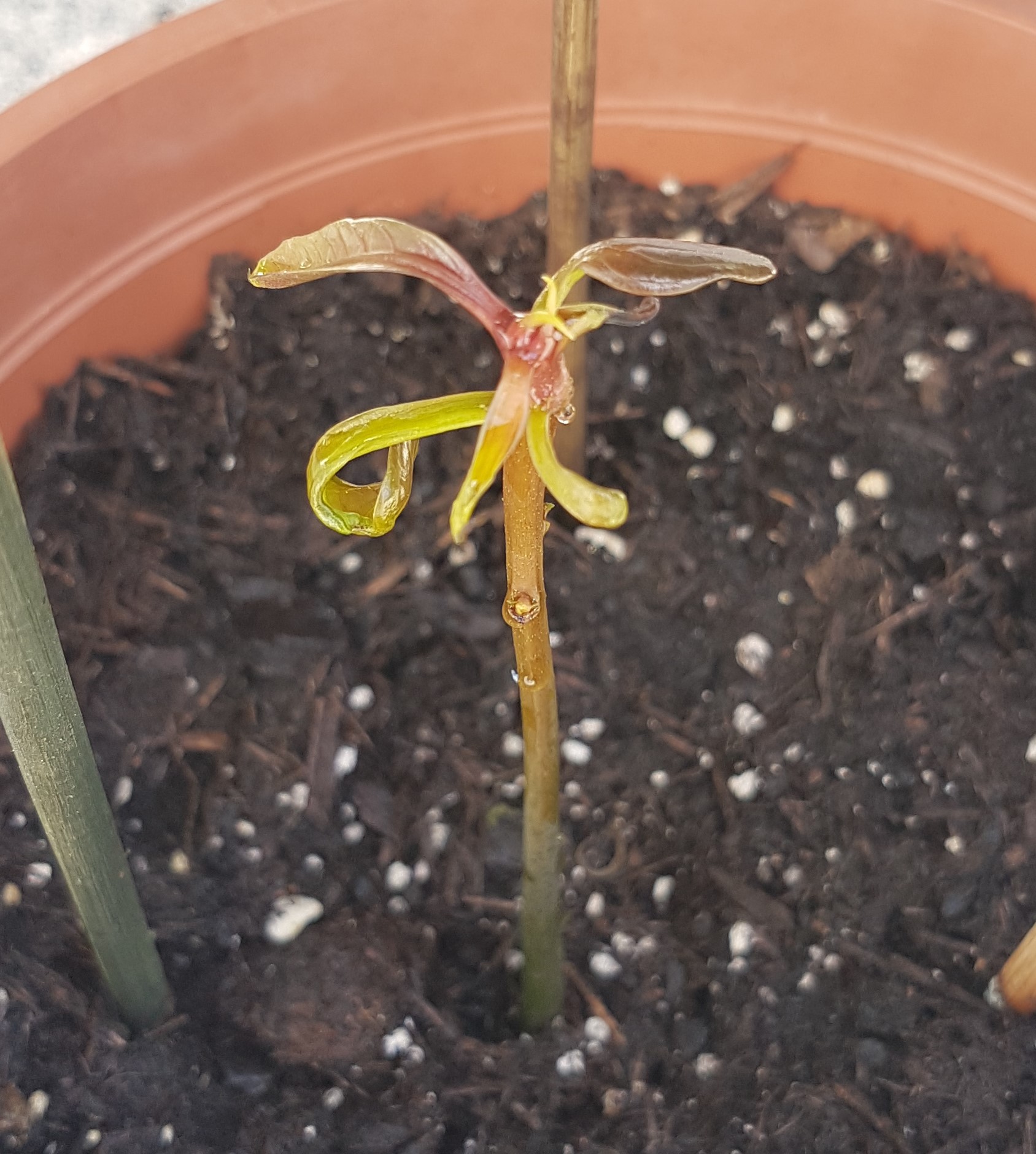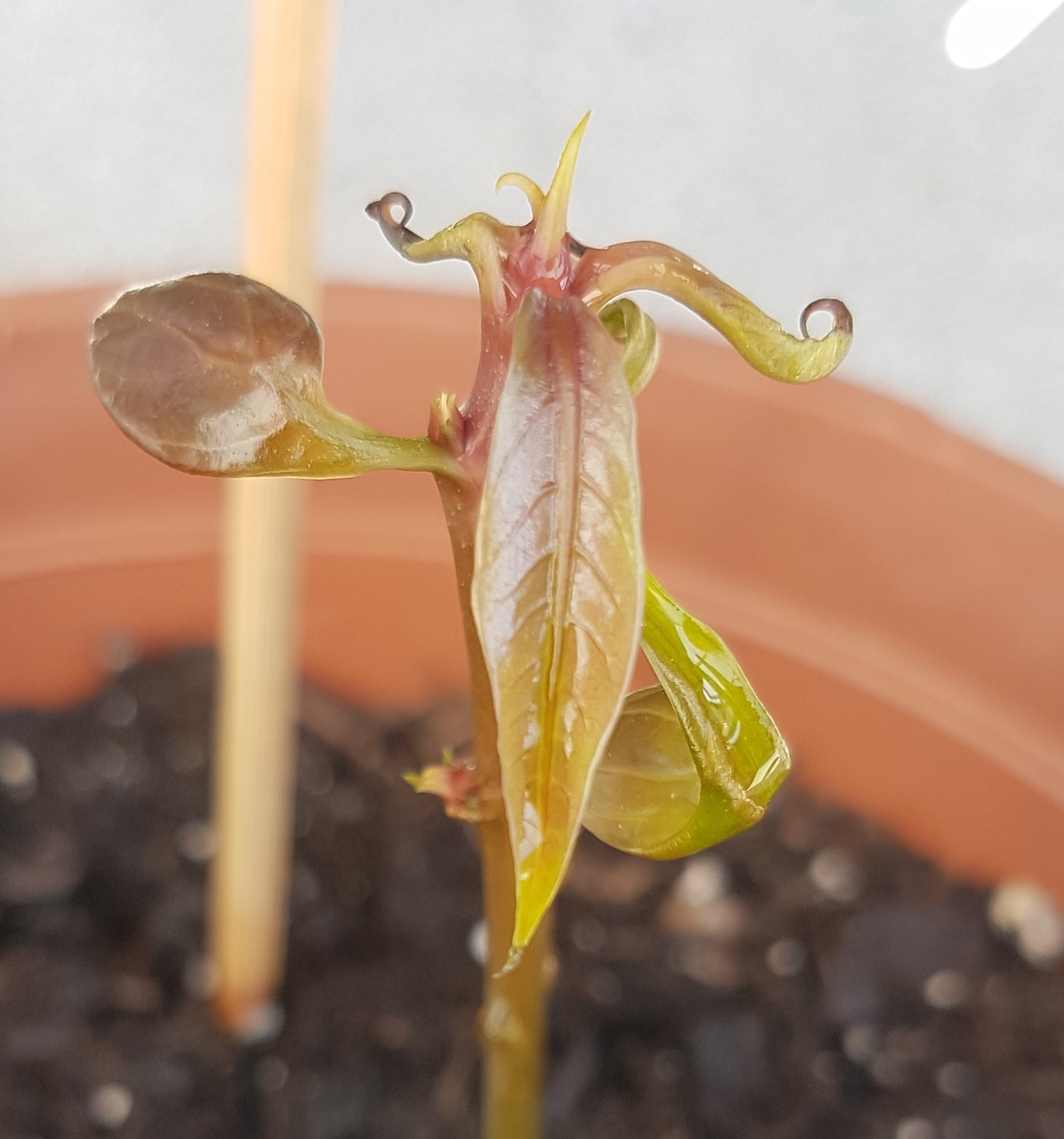 ich habe vor ein paar Wochen ein Mangokern zum Keimen gebracht und diesen später in einen Topf mit normaler Blumenerde gesetzt. Soweit sah alles super aus, nur dann hat der Keim nach paar Tagen angefangen, die Blätter zu rollen. Manche sind auch braun geworden, aber nicht runzelig und die 2 untersten Blätter sind abgefallen.