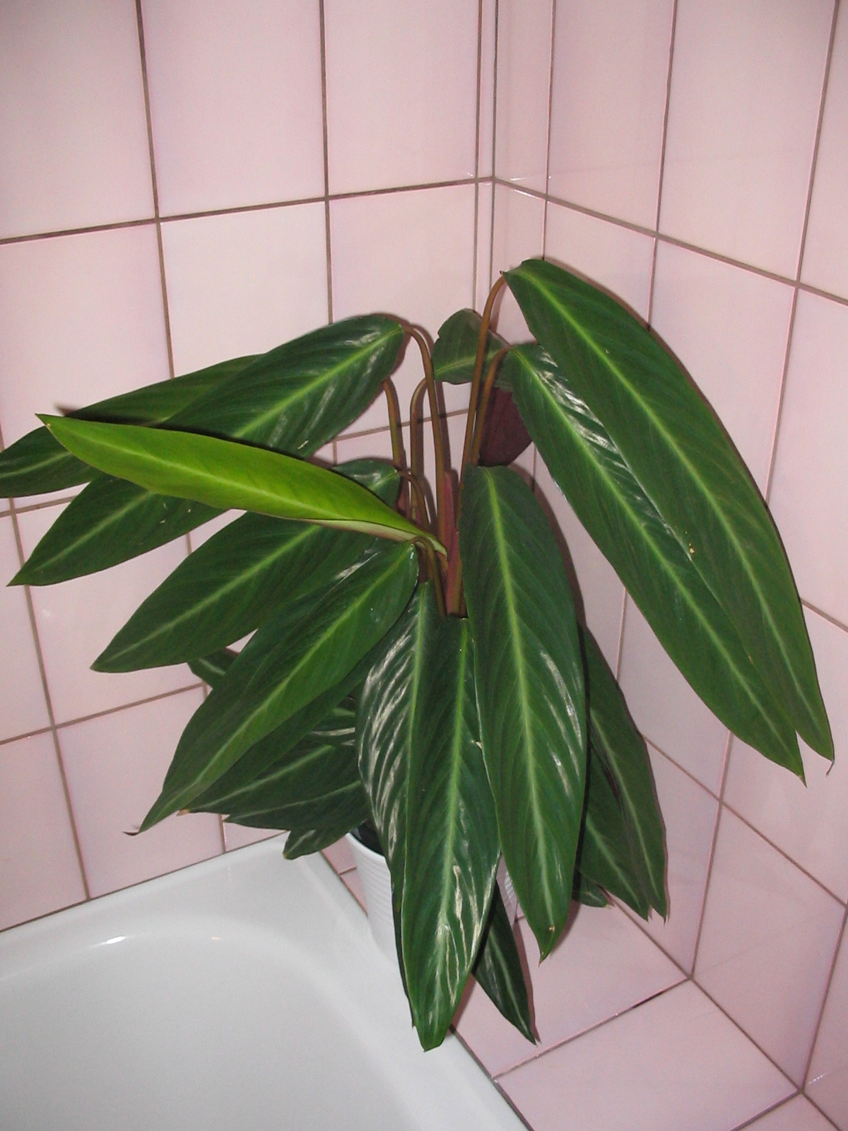 Jetzt hab ich sie im Bad stehen und sie hat grade ein neues Blatt geschoben! Sieht gut aus, wenn so ein großes Ding sich langsam rausrollt.