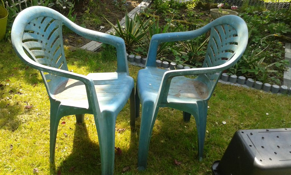 2 ausgediente Gartenstühle (bei denen ich immer zu faul war, die zur Kippe zu bringen)