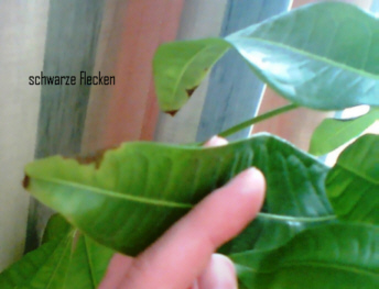 Aber seit Januar fangen verschiedene Blattfinger an, von den Spitzen her zu "vertrocknen", die Adern werden ganz dunkel. Der ganze Baum ist diffus betroffen, weder alle Finger einer Hand, noch dicht aneinander liegende Blätter stecken sich an.