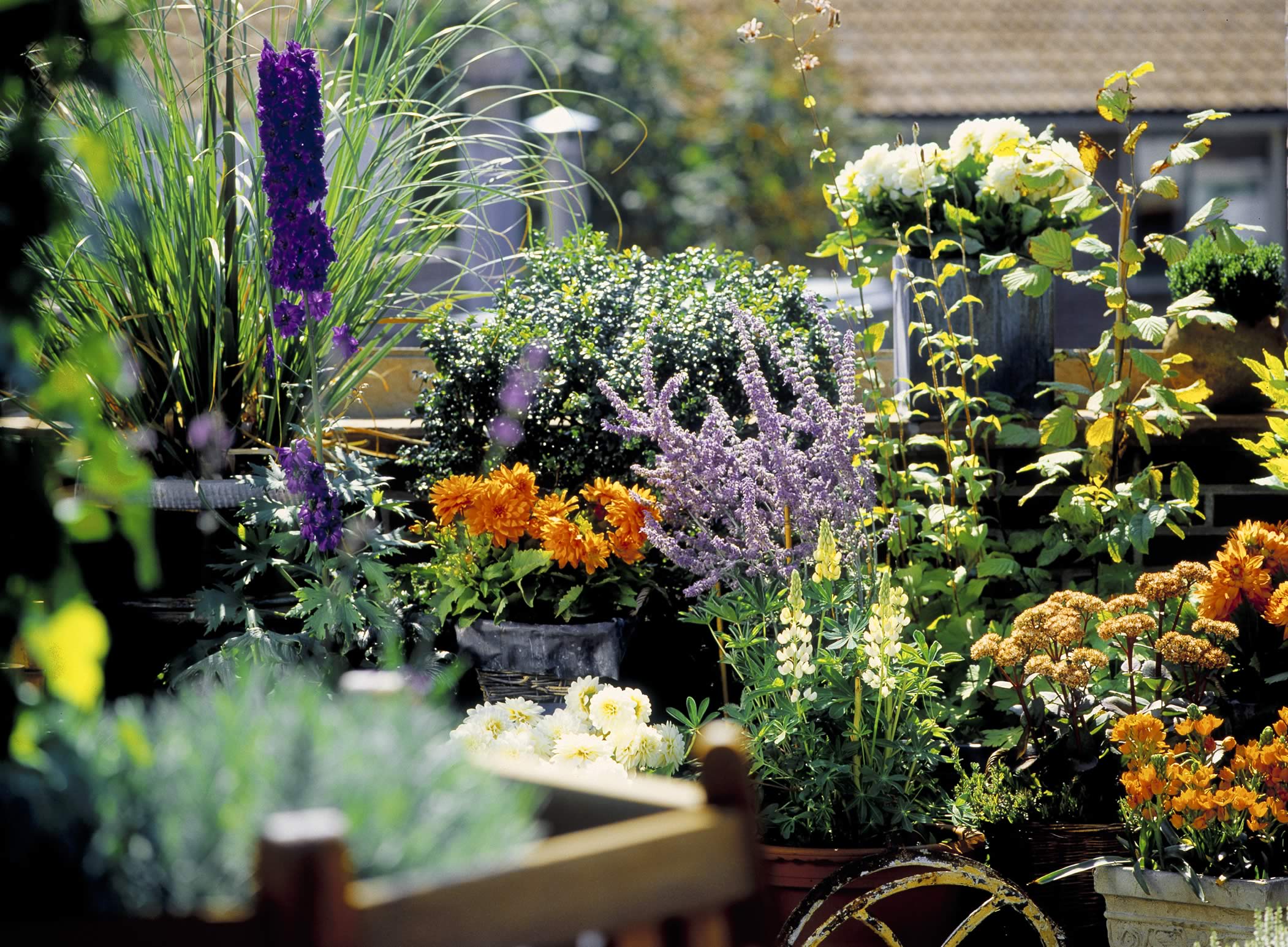 # Sommer pur: Topfdahlien, in unterschiedlichsten Farben, sind typische Sommertopfpflanzen. Mit Sonnenblumen holen Sie sich die Sonne auch an trüben Tagen auf den Balkon.