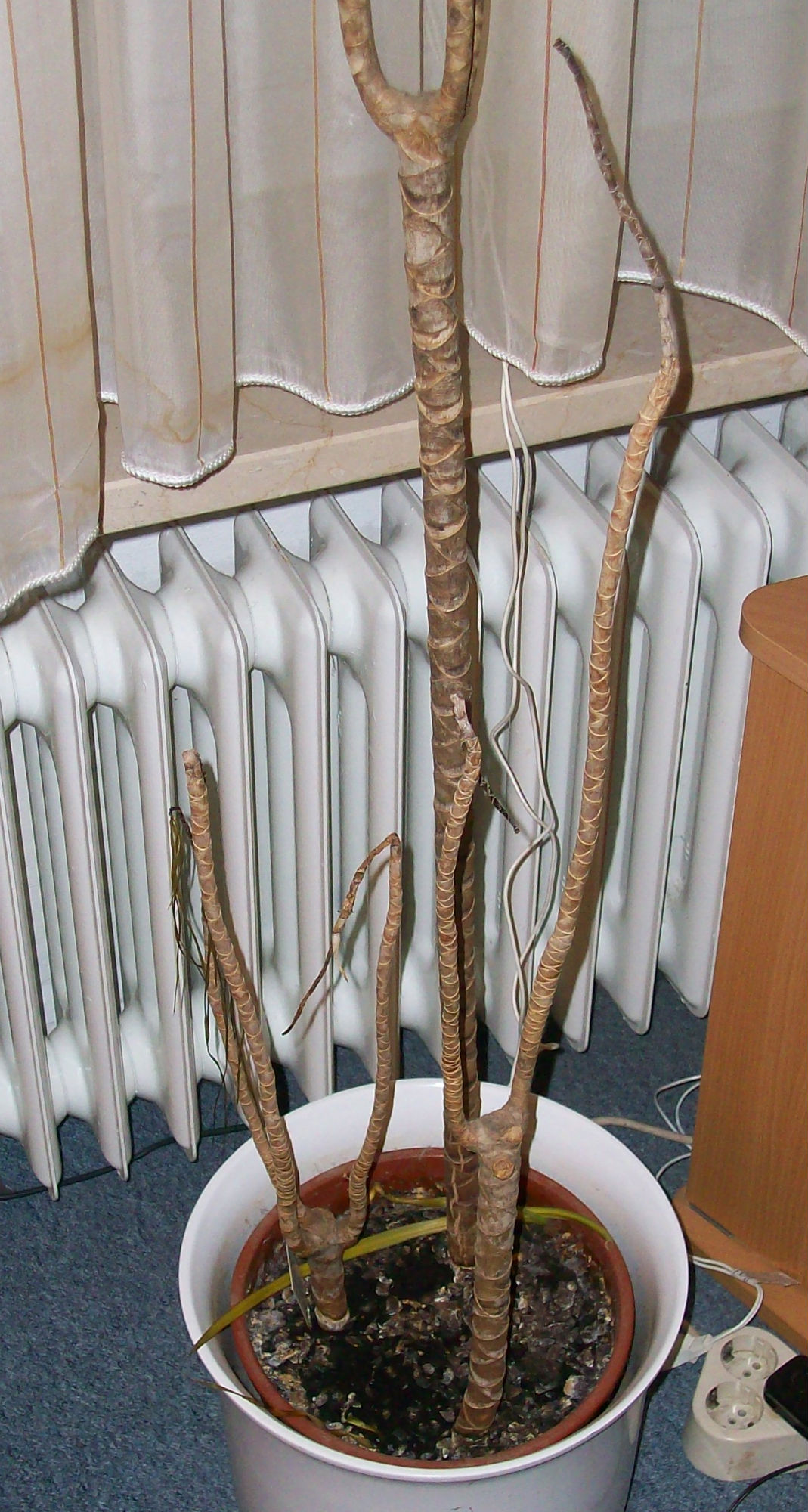 Ich habe diesen Drachenbaum nun schon seit 4 Jahren, einen Umzug hat er auch schon mitgemacht (seit Mai 2009 steht er nun in der neuen Wohnung). Bis vor ein paar Wochen ist er auch noch wie wild gewachsen, hat oben immer wieder kleine Blätter bekommen. Es sind insgesamt 3 Stämme im Topf, ein großer und zwei kleine. Nun ist es passiert, dass die unteren Blätter jedes Stamms gelb/braun geworden sind und abgeworfen wurden. Ich dachte erst, es handelt sich um die regelmäßige "Ich will meine Blätter nicht mehr" Phase. In dieser hat sie dann immer ne handvoll Blätter abgeworfen und dann wars wieder gut, aber diesmal ist es anders. Die kleinen Stämme hat es zuerst getroffen. Wie gesagt wurden die Blätter erst von unten her gelb/braun, sind abgefallen und dann ist der Stamm oben in der Krone ganz weich, immer dünner und auch leicht gelblich geworden und schließlich umgeknickt. Die restlichen Blätter sind natürlich dann auch abgestorben.