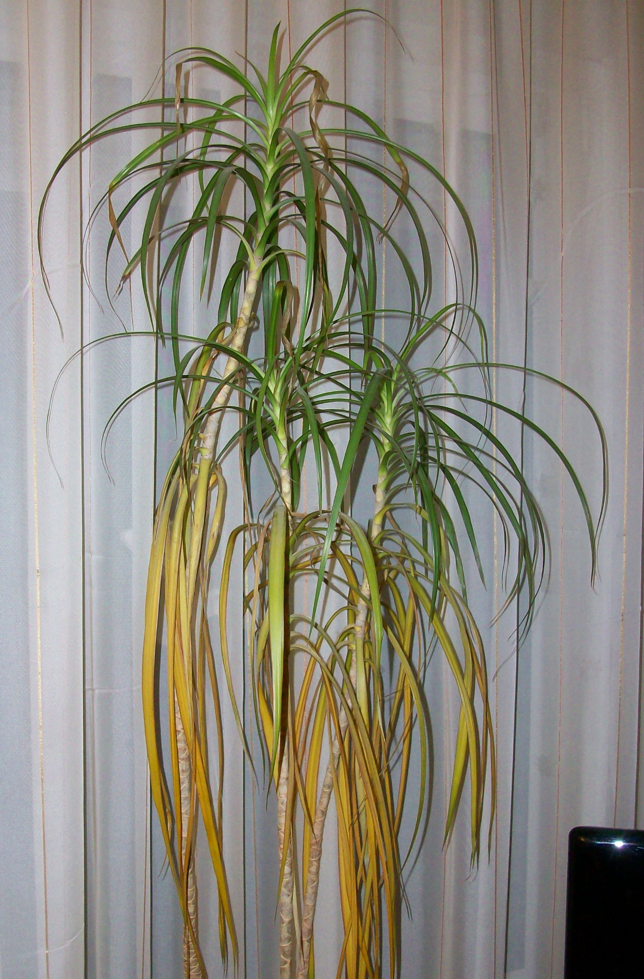 Und jetzt fängt das bei dem großen Stamm auch an. Dort sind die unteren Blätter auch schon alle gelb, nur die oberste Krone in 10-20 cm ist noch in Ordnung. Ich fürchte, dass die Krone auch bald abknickt . Ich bilde mir auch ein, dass das Ganze angefangen hat, nachdem eine Freundin von mir meinte, sie mal aus dem Übertopf heben zu müssen, um zu sehen, ob unten aus dem Pflanztopf (?) Wurzeln herausragen (taten sie nicht). Oder es hat mit dem Beginn der Heizperiode zu tun...