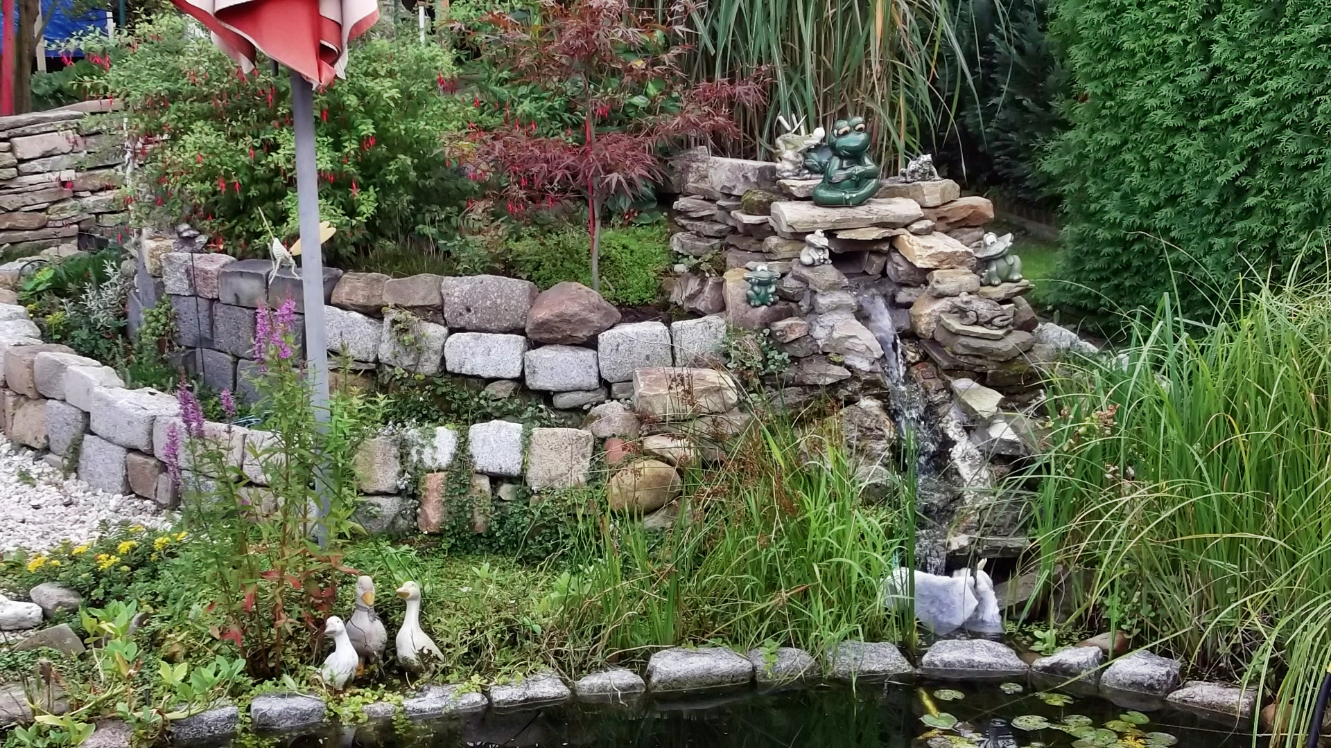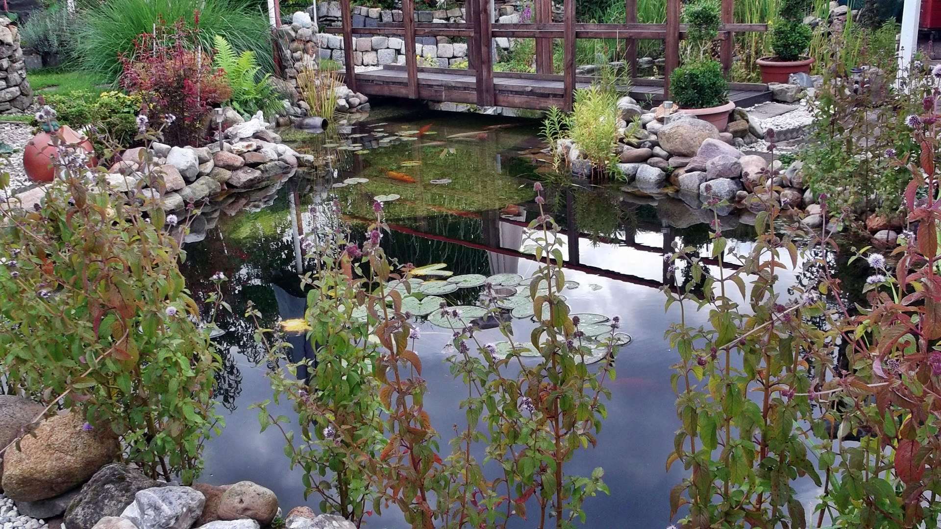 Der Teich besteht seit 2005, hat 25.000 Liter, Filter Eigenbau, einen Bachlauf und 2 Skimmer. Viele unterschiedliche Pflanzen, wie Teichrosen, Wasserminze usw. Es sind 8 Koi von unterschiedlicher Größe von ca. 50 -60 cm bis 20 - 25 cm, 2 Goldorfen auch ca. 50 - 60 cm groß, 1 Rotfeder und 1 Goldi.