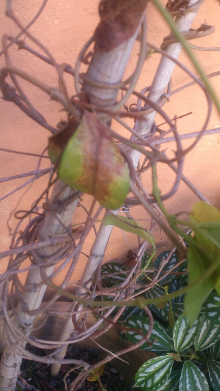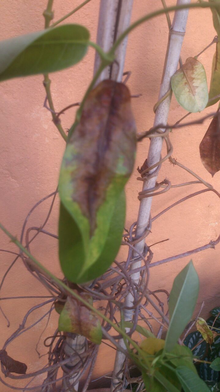 Mandevilla, Lieblingsblume ist krank. Die Blätter sind gelb und einige haben braune flecken. Der Stamm sieht trocken aus.