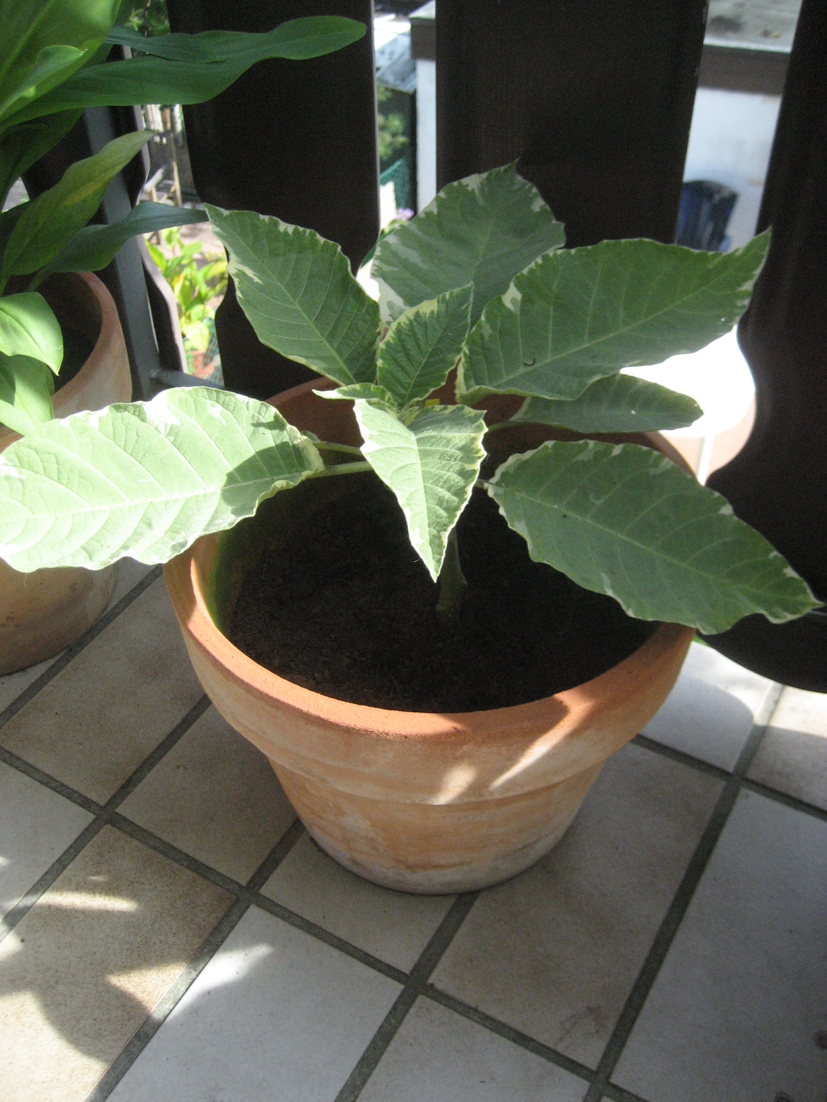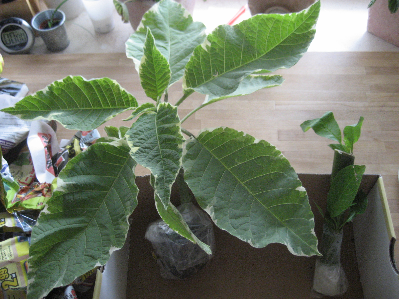 Als erstes habe ich ein Paket von DonnaLeon bekommen, mit einer schönen panaschierten Engelstrompete "Maya" und noch ein Stecki vom Apricot Rießen.